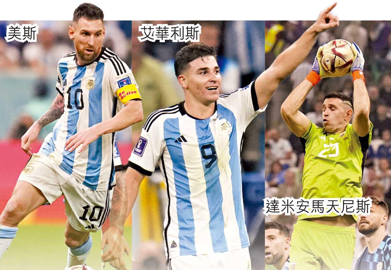 法國衛冕之旅亦非坦途,大軍受傷病困擾,幸準決賽更憑左閘迪奧靴南迪斯及後備前鋒高路梅安尼各入一球,淘汰摩洛哥,力爭自1998年及2018年後,三奪世盃。麥巴比現時跟美斯一樣以5球並列射手榜首位,近兩仗雖食白果,但隊友紛紛挺身而出,而前鋒拍檔基奧特已攻入4球,加上基沙文助攻助守,這個進攻鐵三角的火力,當然不遜已連續5戰入2球或以上的阿根廷。