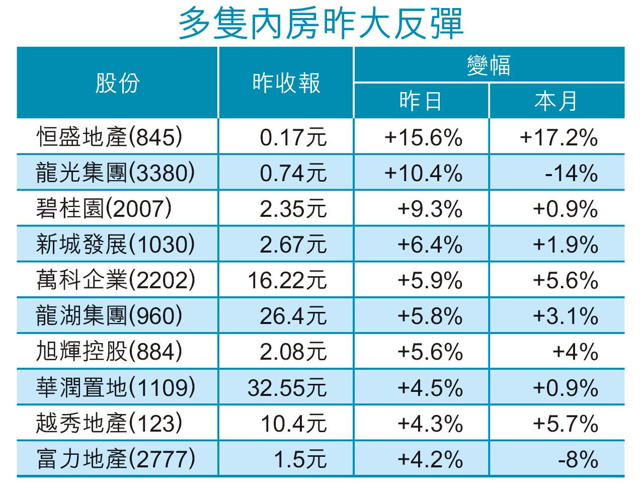 除外匯降準消息沖喜外,高盛昨亦引述數據指行業最近一周銷售有改善,指近周新樓銷售按周漲9%,按年則跌33%,當中一線城市銷售按周多半成,二線城市增6%,三線城市則大升13%。除碧桂園系飆逾9%外,龍湖集團(960)昨亦大漲5.8%,華潤置地(1109)急升4.5%,中國海外(688)亦升3.5%,全部躋身藍籌5大升幅王。部分次線內房升勢亦明顯,龍光集團(3380)狂飆逾一成,新城集團(1030)亦漲逾6%。