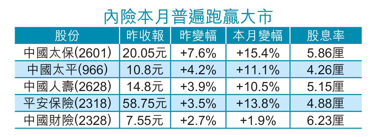 國壽昨一度逼近15元大關,收市報14.8元,大升3.9%,為2021年5月後高,較11月即市低位反彈近74%;平保亦逼近60元關口,昨報58.75元,升3.5%,為去年2月後高,累計由去年12月即市低位反彈近九成。至於昨彈4.2%的中國太平(966)、及飆7.6%的中國太保(2601),與平保一樣均逼近去年2月後的近1年高位,隨時破位創52周高。