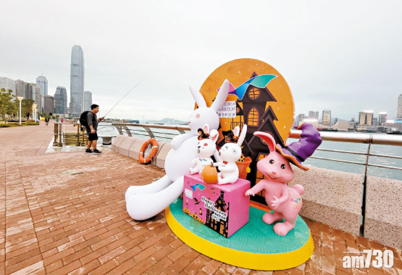 細心發現,清水混凝土和木系構築物的休憩空間亦有兩個搞怪小鬼「飄」在半空,沿路玻璃圍欄也貼上不同小鬼貼紙,會展至添馬公園位置則有一系列萬聖節造型的兔子裝飾。原來整個應節主題展覽由「三唇製造」、「港鬼故」及「BOOKYAY」聯合主辦,今日起舉行至萬聖節,費用全免;有興趣市民更可參與「南瓜大搜查小遊戲」。活動未「起錨」,矚目的巨型南瓜及可愛兔子已吸引不少市民到場打卡。