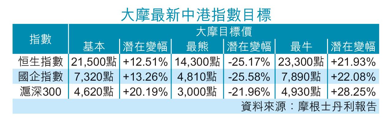 該行又認為,在岸市場資金充足,且受中美緊張關係影響較小,加上人民幣短線仍偏弱,相信A股長期表現較離岸市場佳。因此,大摩將滬深300指數基本目標價上調約3%,至4,620點,潛在升幅高達兩成,較MSCI中國及港股指數的潛在升幅更大。至於恒指目標價則由24,500點,大削12.2%至21,500點,潛在升幅12.5%;國企指數基本目標7,320點,潛在升幅13.3%,最熊則看4,810點,即最多看跌25%。