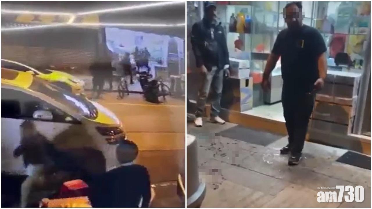 另一段短片見到,部分刀手得手後跳上私家車離開,而遇襲男事主則右手腕嚴重受傷淌血,血肉淋漓,手腕幾近斬斷。最後一段影片則拍到遇襲店舖內的情況,食物陳列櫃玻璃爆裂,地面血跡斑斑,儼如一條血路。