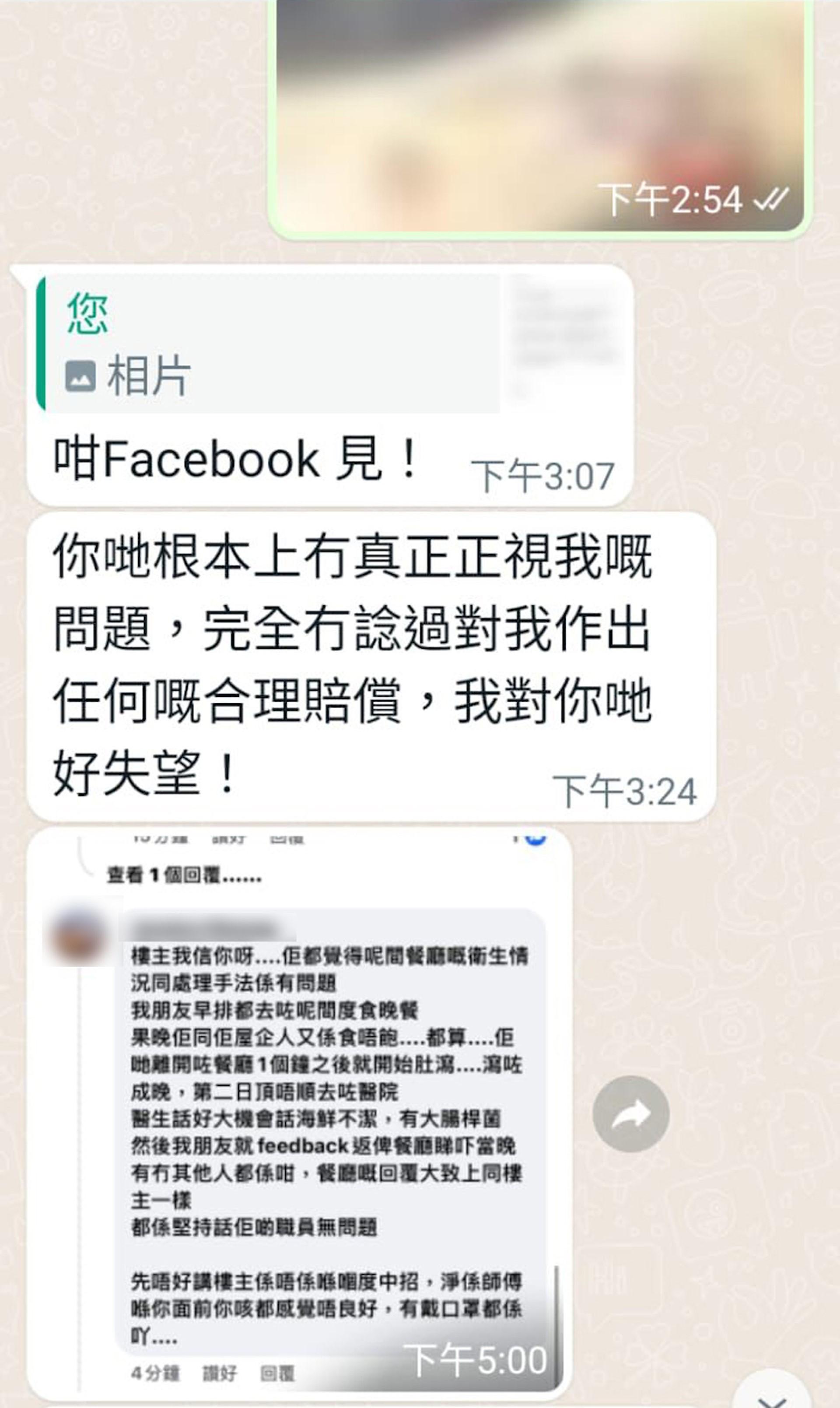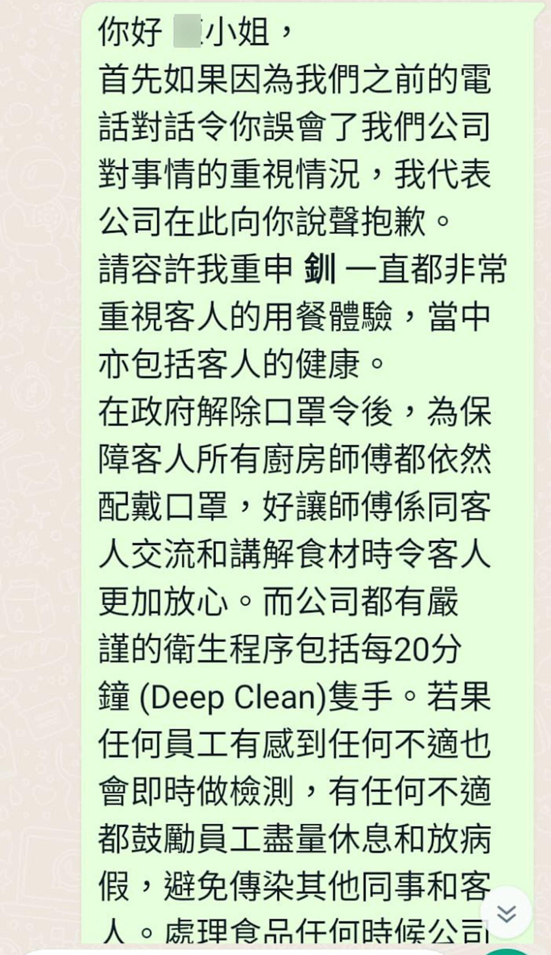 餐廳回覆訊息時就港女不快用餐經歷致歉,並希望致電了解情況。經理解釋「師傅有一定年紀,有時氣管敏感會出現幾聲咳嗽,因此一路以來他和全店員工都是帶着口罩去招呼客人,一直以來亦都冇收過任何這方面投訴」。但港女不滿答覆,一口咬定認定廚師是感染源頭,同時要求全單退款。