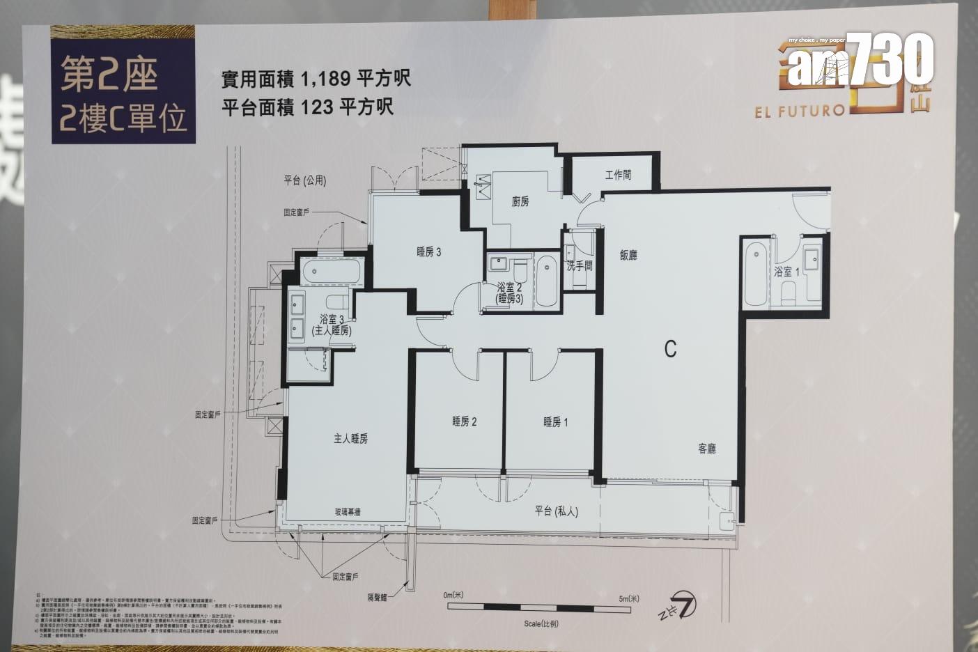該2伙特色戶包括第2座2樓C室,實用面積1,189方呎,連123方呎平台;另為第2座25樓A室,實用面積1,217方呎,連444方呎天台,天台特設按摩浴池。郭子威稱,項目的天台特色戶過往平均成交呎價約2.8萬元,相信是次可挑戰項目呎價新高,約3萬元水平。