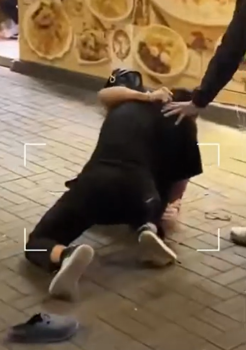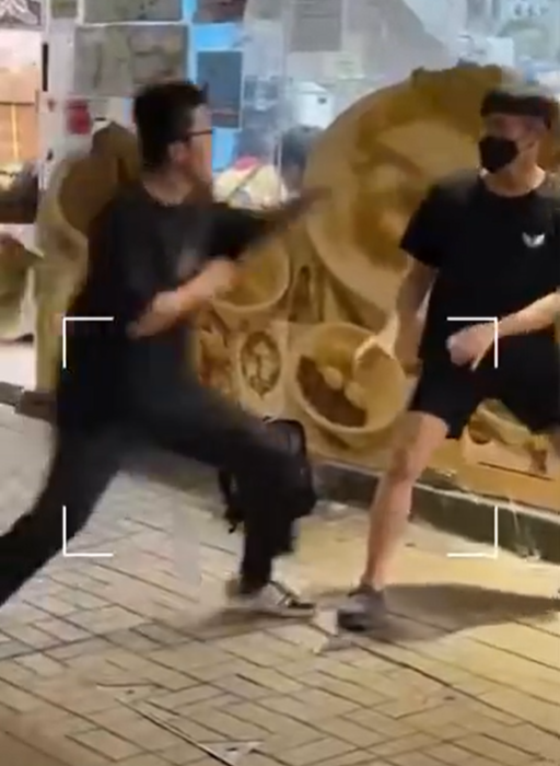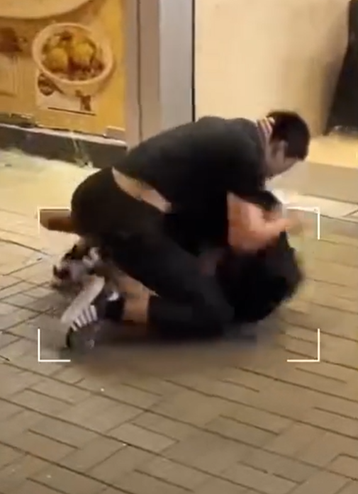 街頭MMA打到甩鞋,賣仔不甘被斥「食物鏈最底層」大打口罩男。(FB香港突發事故報料區)