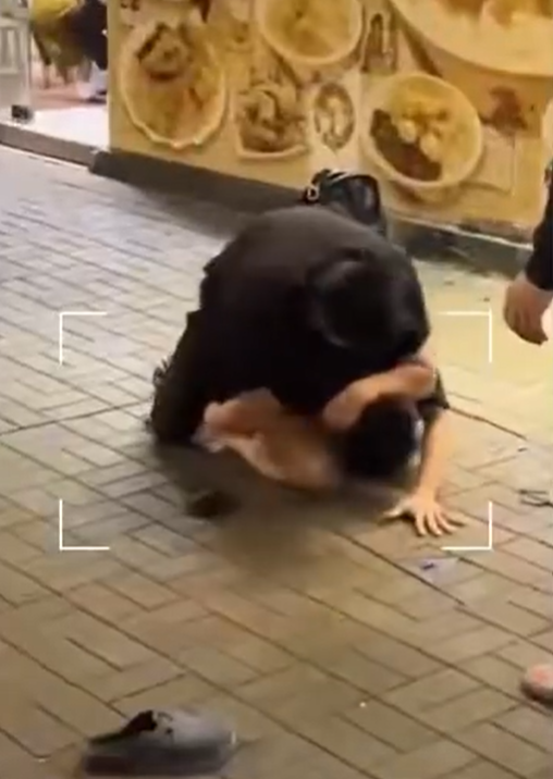 兩者互罵間,口罩男突然拉下口罩向對方吐口水,外賣員立即掌摑還擊,又放低手中紙袋,隨後外賣員逼近口罩男出拳,更將對方壓在地上,混亂中二人毆作一團,口罩男多番掙扎無力反擊,甚至連腳上的拖鞋亦被打至飛脫。