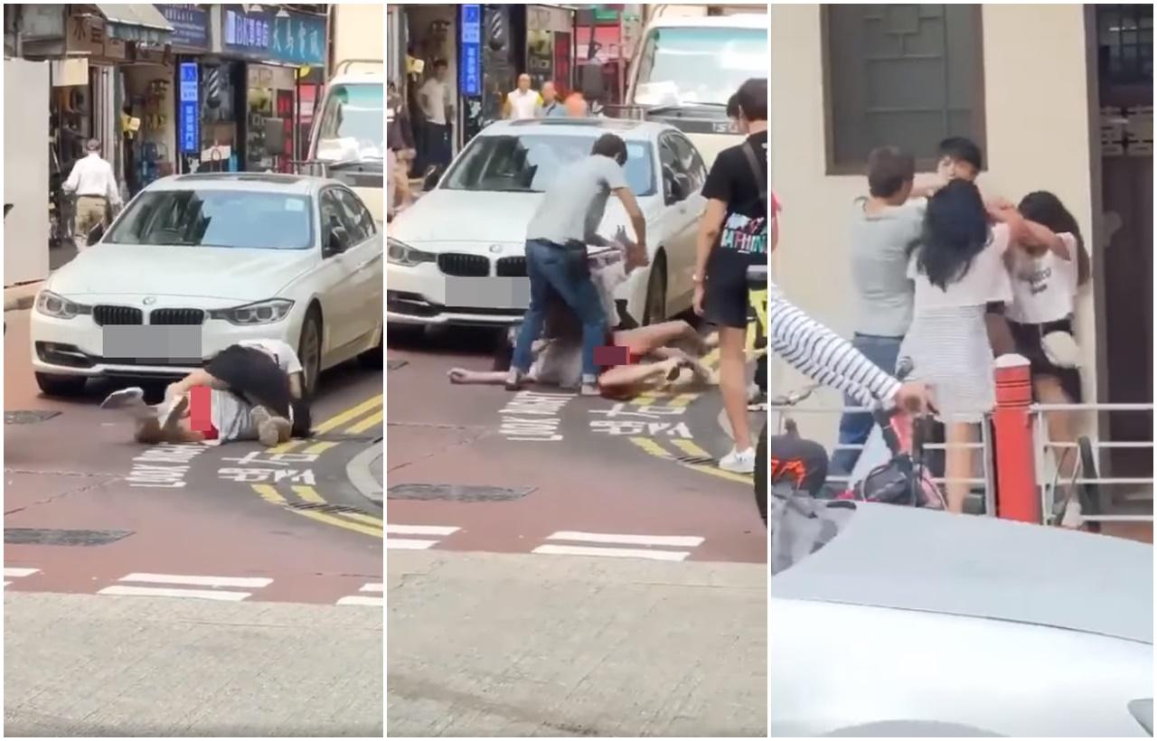 畫面一轉,一名白衣男子出現,試圖分開兩名女子,惟被灰衣男拉開,兩名女子隨即起來又轉到馬路上扭打,此時戰況開始激烈,兩名女子互相揮拳及扯頭髮,灰衣男和白衣男連忙上前一同嘗試分開兩女,惟兩名女子仍然沒有理會,再次打到跌在地上,期間穿淺色裙的女子不顧走光底露,不斷地用雙腳踢開白衣男。