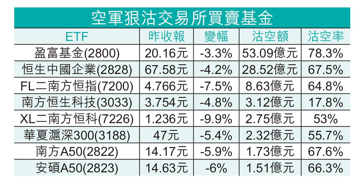 遍地牛屍下空軍炮火卻未見收斂,昨大市沽空額288.5億元,沽空率21.4%,再創兩個半月高,交易所買賣基金(ETF)繼續成為目標,盈富基金(2800)沽空額53.1億元稱冠港股,沽空率78.3%;恒生中國企業(2828)緊隨其後,錄28.52億元沽空額,沽空率67.5%;追蹤恒指兩倍槓桿的FL二南方恒指(7200)及追蹤科指兩倍槓桿的XL二南方恒科(7226),亦分別高達8.6億元及2.75億元的沽空額,沽空率64.8%及53%。