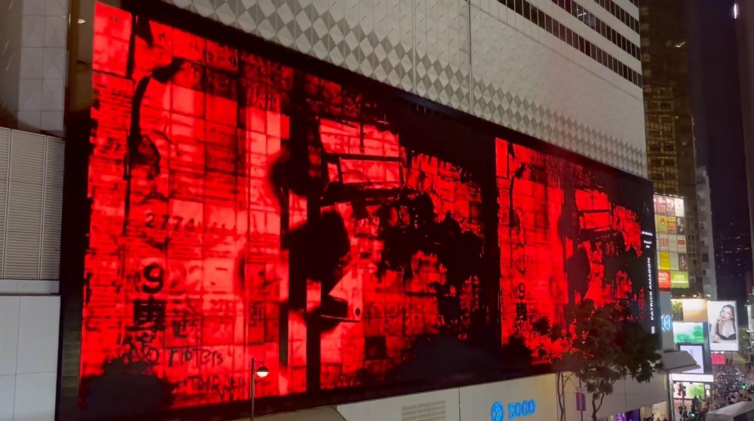 美國藝術家阿馬頓(Patrick Amadon)製作名為《No Rioters》的影像作品,早前於銅鑼灣崇光百貨(SOGO)的大型LED顯示屏展示,當中被發現內含反修例被捕或被定罪人士的姓名及資料等,有傳媒前去查看,發現相關作品已沒有展示。