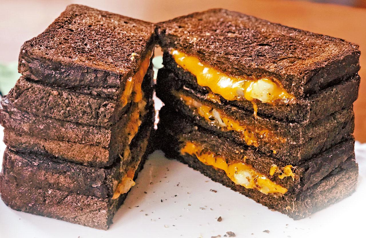 黑麥芽酸種麵包,具有明顯黑麥芽風味,經36小時長時間發酵的天然香氣極濃厚。如果光吃麵包,有些人會嫌帶點腥和酸,不妨就做這個車打芝士蝦吐司。麵包塗牛油,夾好車打芝士片、百里香以及急凍蝦肉(食譜原用乾蝦粉),用橄欖油以中慢火煎至金黃(煎時可用力按壓),取而代之就是誘人的烘焙與融化芝士香,咬落更剛好鬆脆。