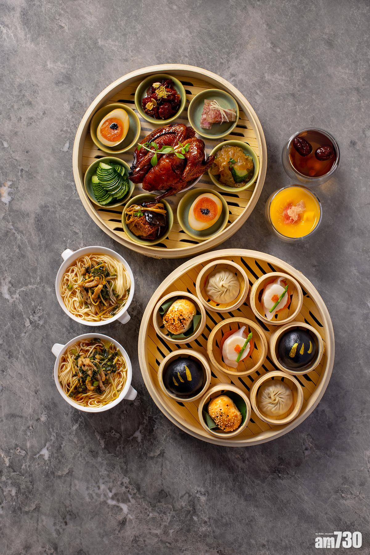 「十里洋場」首推經典淮揚下午茶套餐,分為開胃涼菜、點心、主菜及粉麵四個部分置於大小蒸籠內,$338可品嘗到合共12款料理!包括陳醋紅蜇頭、水晶肴肉、金絲小排骨、蓑衣黃瓜、四喜烤麩及黑松露珍珠燻溏心蛋;另一個巨型蒸籠則包含四款巧手點心(每款兩件),有金牌小籠包、帶子鳳眼餃、鮑魚火腿酥及黑金流沙包,鹹甜交錯。置於巨型蒸籠中央的,正是十里洋場大受歡迎的脆皮煙燻BB鴿,每人都有半隻十分飽肚!最後是配搭滋潤熱飲四選一,包括楊枝甘露、菊花蜜桃柚子蜜、紅棗圓肉杞子茶、麥米薏米檸檬水,