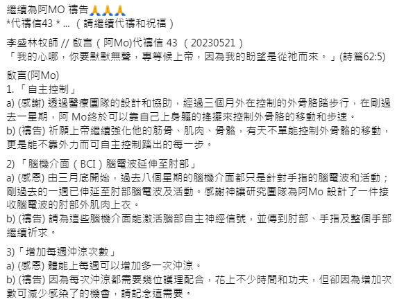 b) (禱告) 祈願上帝繼續強化他的筋骨、肌肉、骨骼,有天不單能控制外骨骼的移動,更是能不靠外力而可自主控制踏出的每一步。