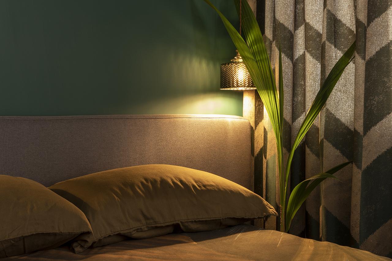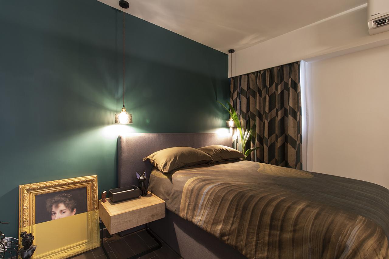這位戶主並沒有小孩,與太太二人世界,所以構思單位間隔設計亦比較靈活,例如原單位屬於兩房間隔,戶主決定改為一房,令睡房的空間更見使,擺放主人睡床之後,甚至能夠三邊落床,至於房間的用色就比較沉穩,戶主選擇了墨綠色做床背的牆身,有令人安神放鬆的感覺。