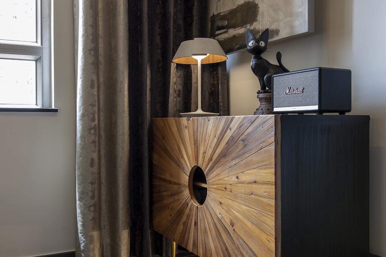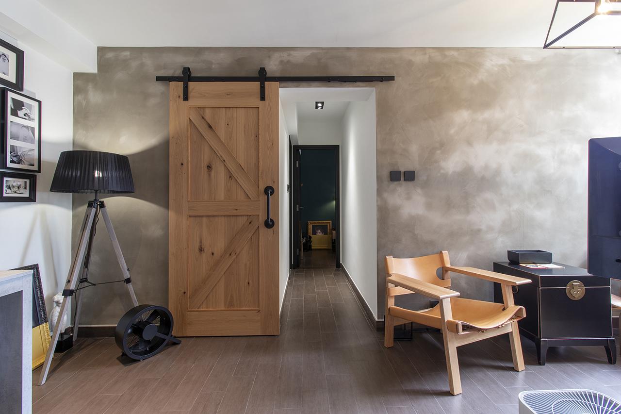 戶主喜歡輕工業風的室內設計,於是以灰色做主色調,並用了不少鐵的元素,例如燈飾,令單位帶有型格硬朗的感覺。而連接客飯廳與睡房的走廊位置,戶主選擇安裝穀倉門,穀倉門的設計源於歐美農莊,特別之處在於安裝後仍然可以看到金屬滑輪、滑軌,風格鮮明,與輕工業的家居十分配搭。