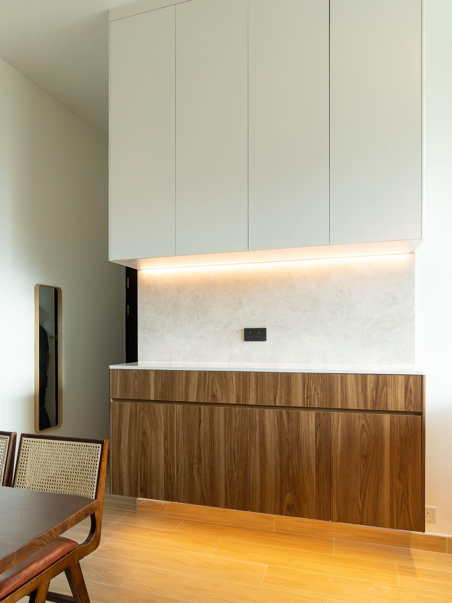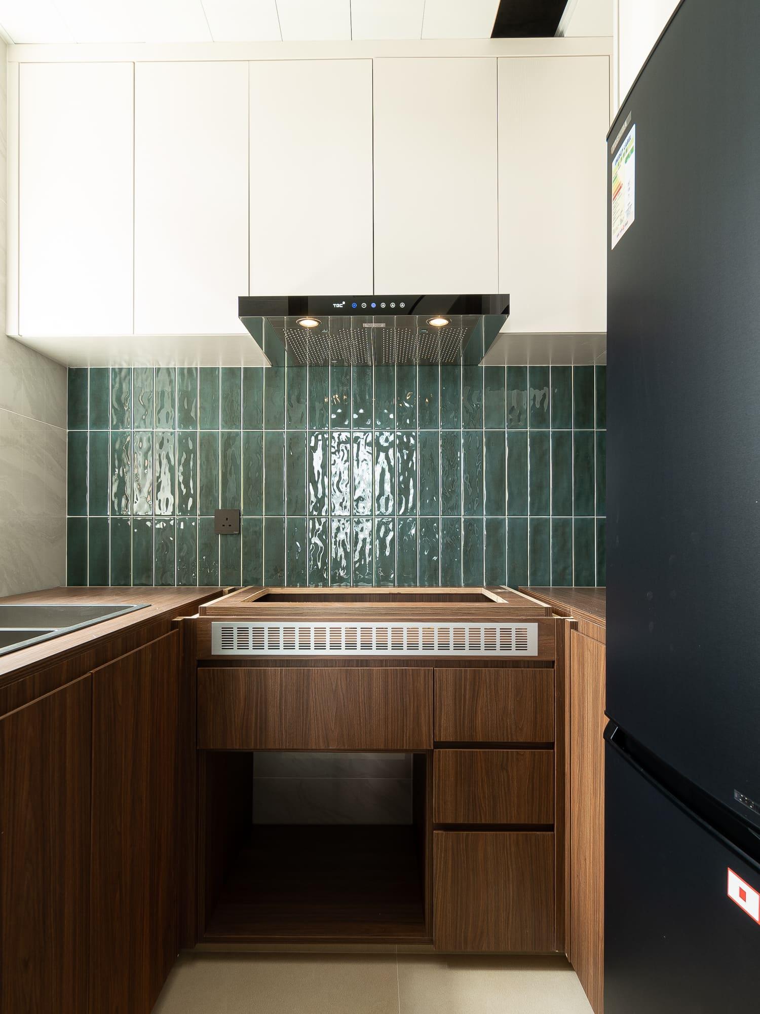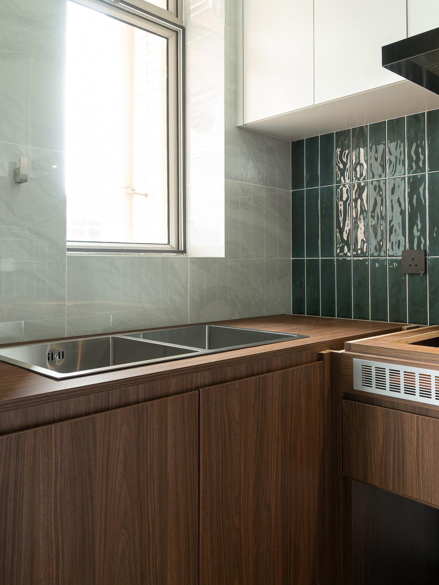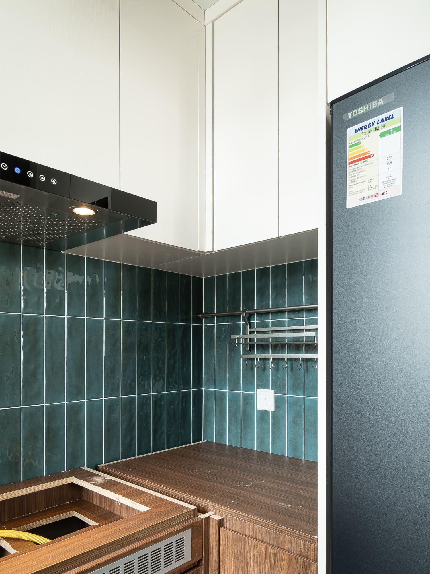 廚房亦沿用相同的設計風格,上下廚櫃用不同的顏色組合配搭,上廚櫃用簡潔的白色,下櫃用木紋感較重的飾面,牆身就選用綠色麵包磚,配搭十分耐看,廚房的間隔屬U型,故亦有相當多的儲物空間。至於浴室就用比較大路的配搭,水泥紋牆身,木紋廁櫃,再配石英石檯面石,都是耐用耐看的用料配搭。