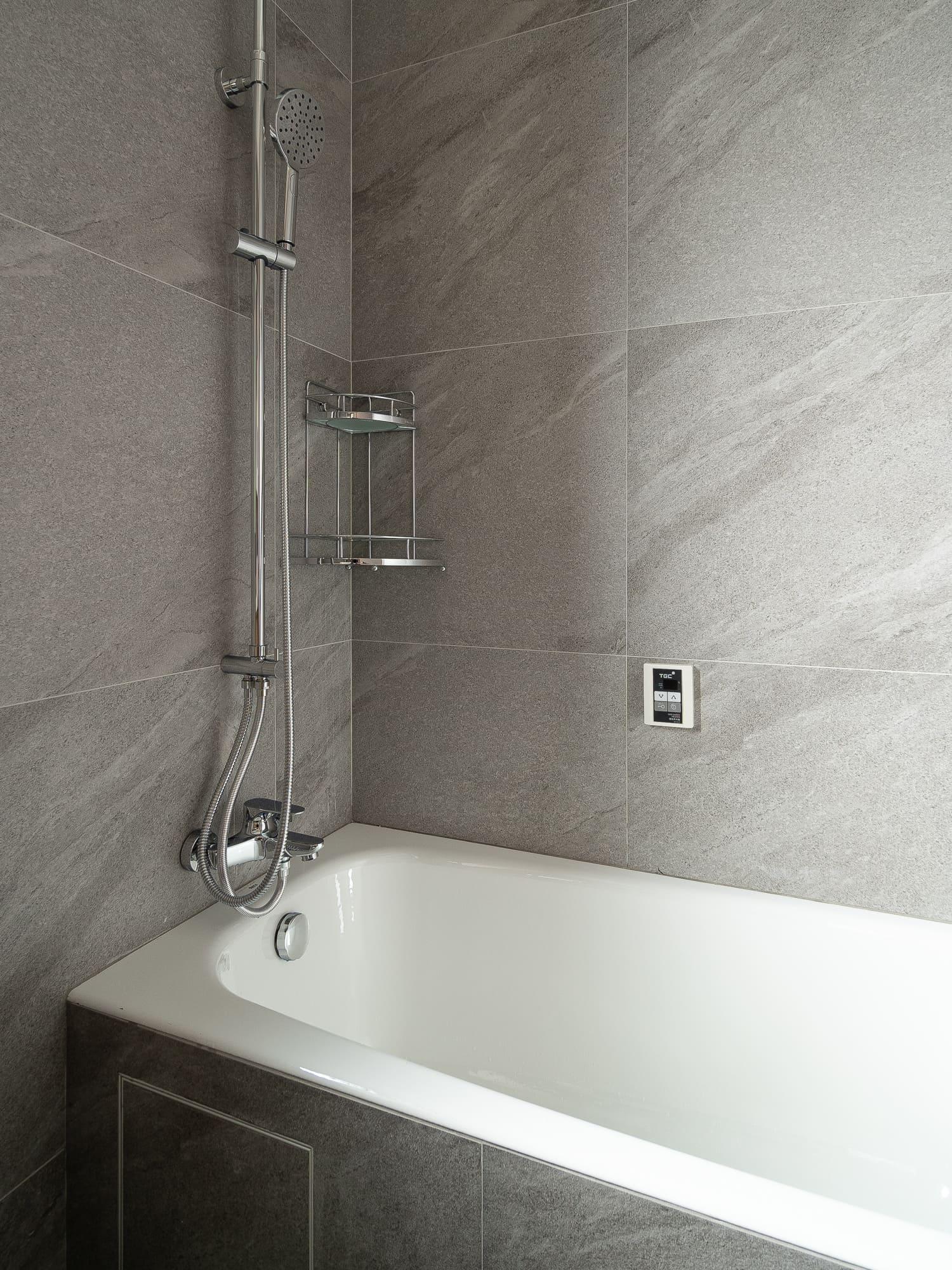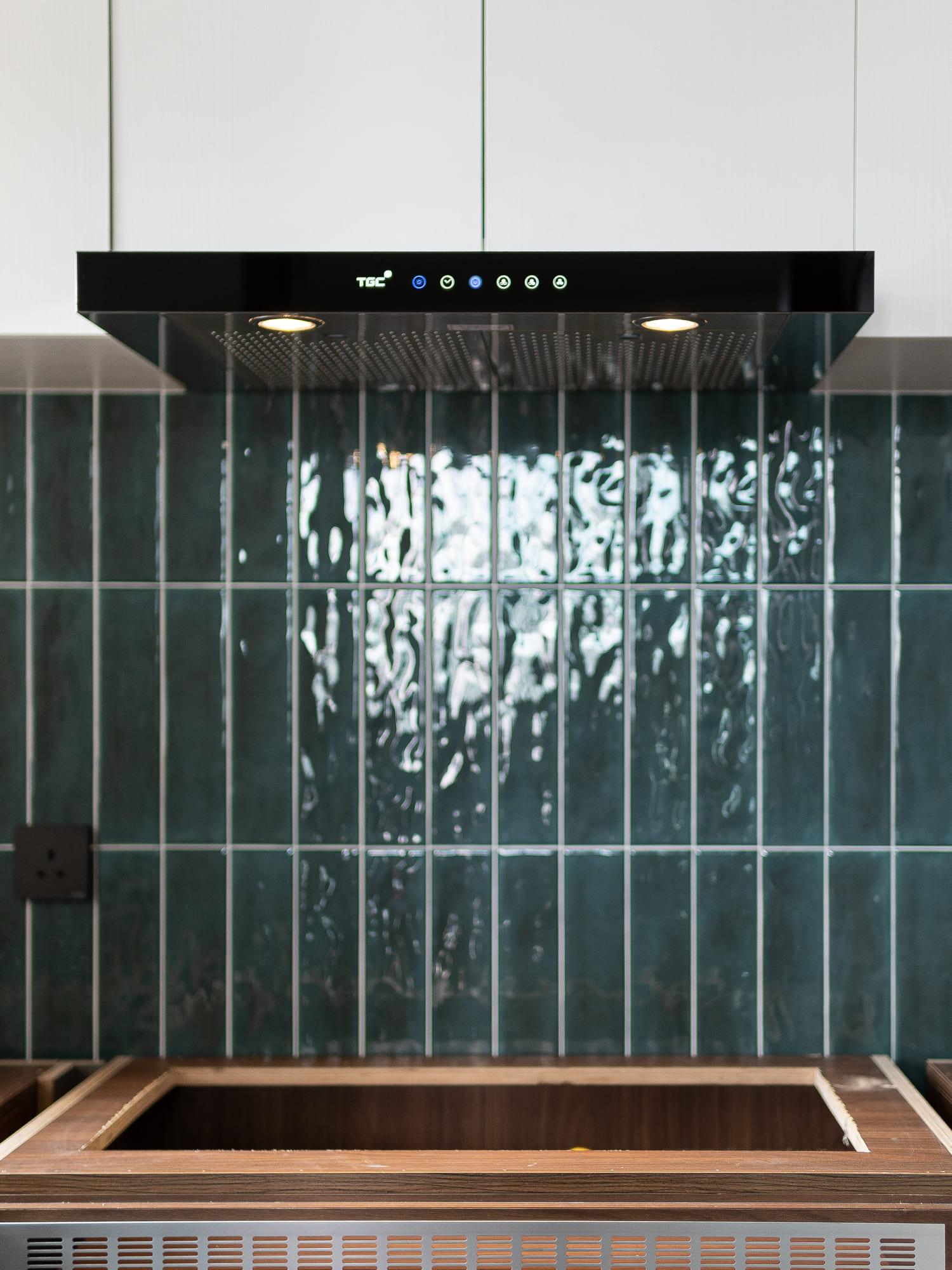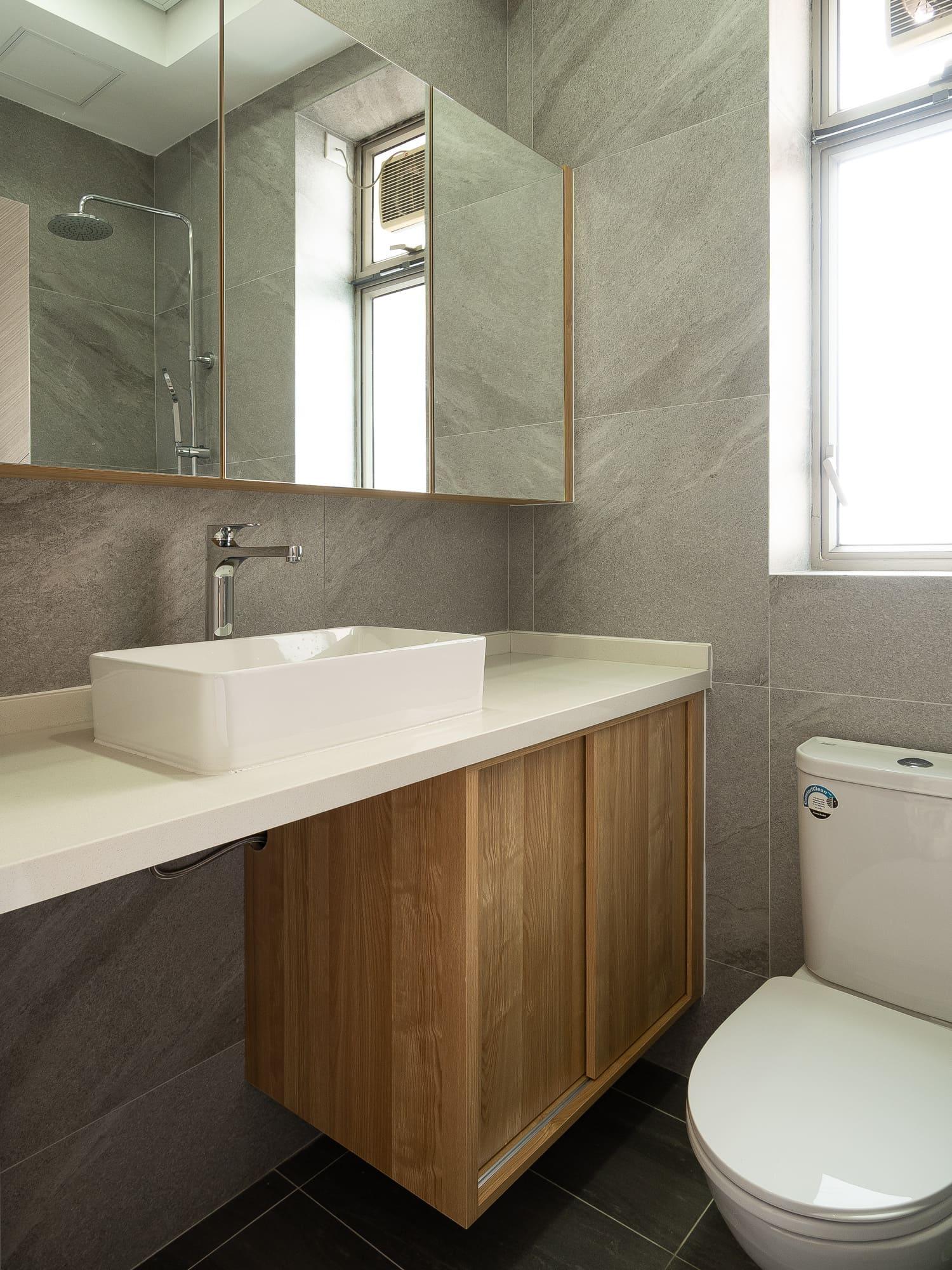 廚房亦沿用相同的設計風格,上下廚櫃用不同的顏色組合配搭,上廚櫃用簡潔的白色,下櫃用木紋感較重的飾面,牆身就選用綠色麵包磚,配搭十分耐看,廚房的間隔屬U型,故亦有相當多的儲物空間。至於浴室就用比較大路的配搭,水泥紋牆身,木紋廁櫃,再配石英石檯面石,都是耐用耐看的用料配搭。