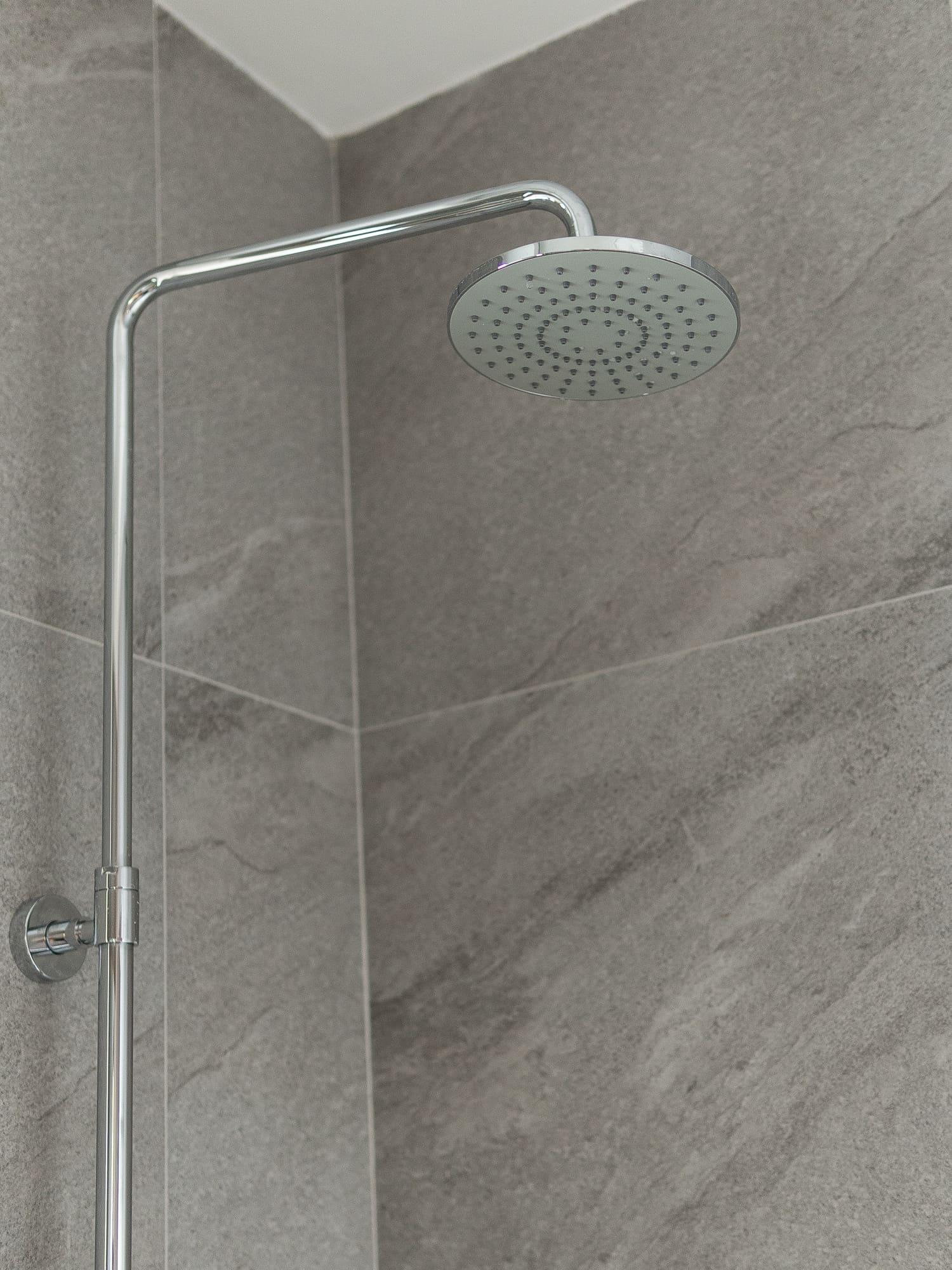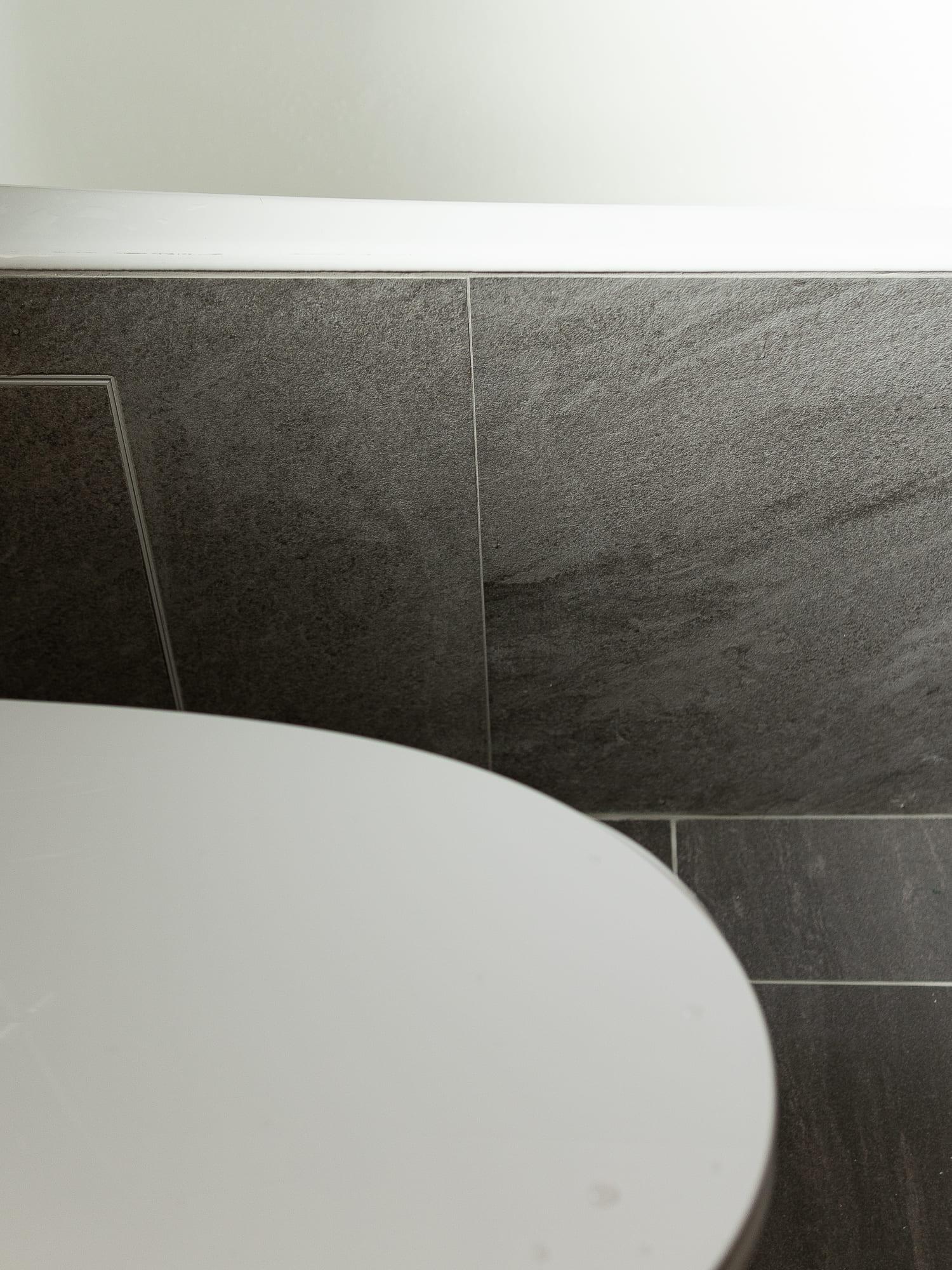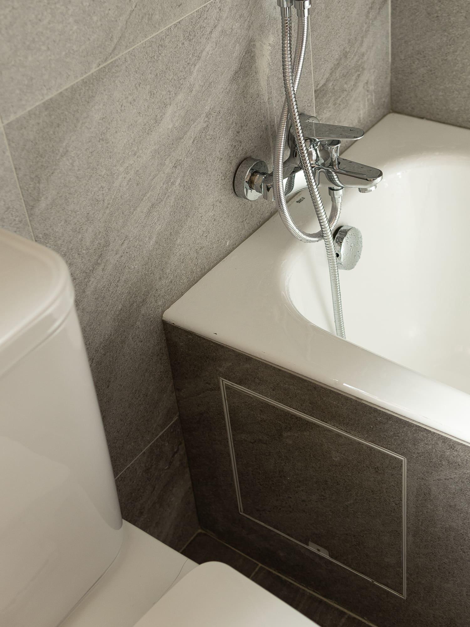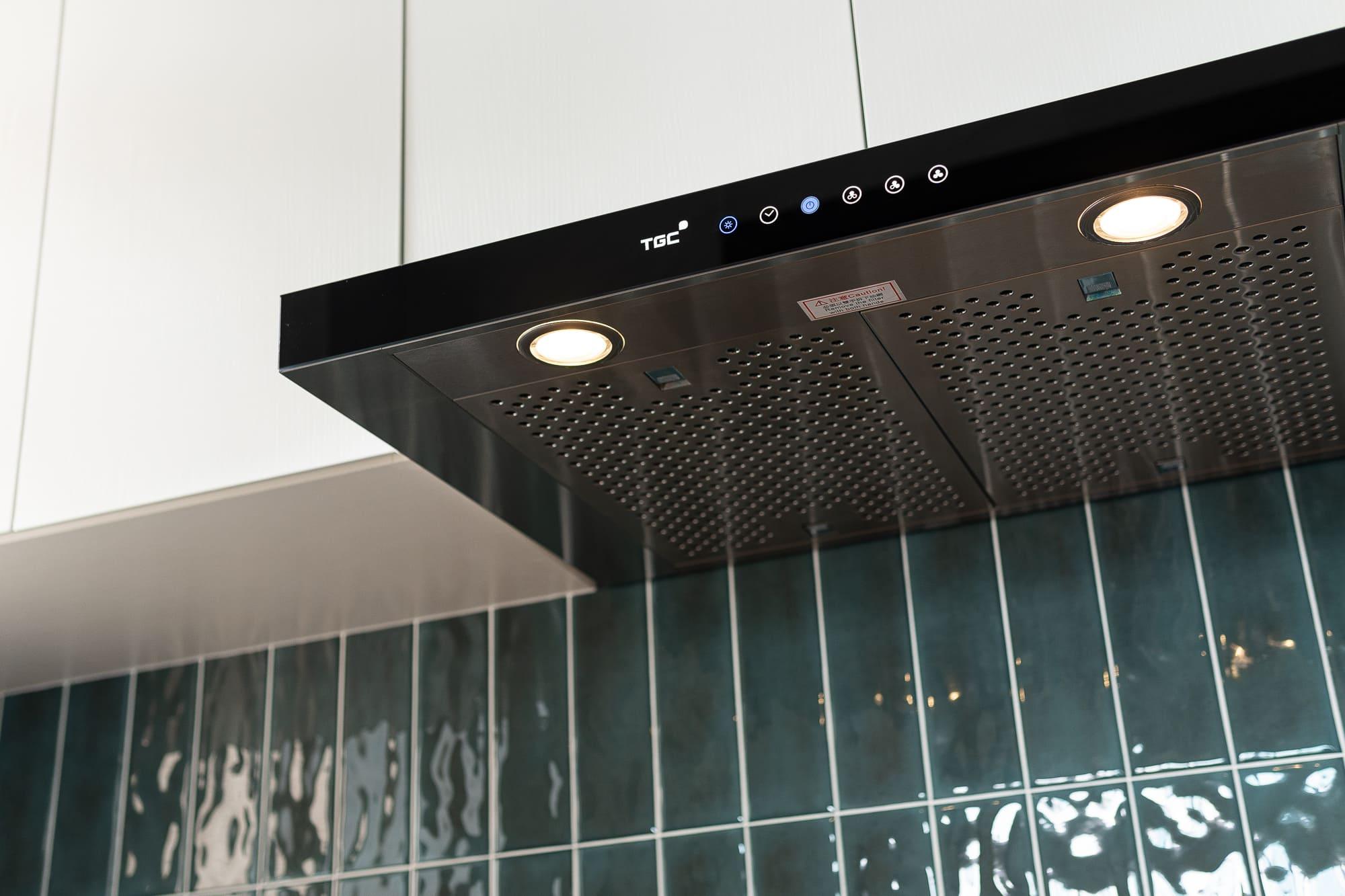廚房亦沿用相同的設計風格,上下廚櫃用不同的顏色組合配搭,上廚櫃用簡潔的白色,下櫃用木紋感較重的飾面,牆身就選用綠色麵包磚,配搭十分耐看,廚房的間隔屬U型,故亦有相當多的儲物空間。至於浴室就用比較大路的配搭,水泥紋牆身,木紋廁櫃,再配石英石檯面石,都是耐用耐看的用料配搭。