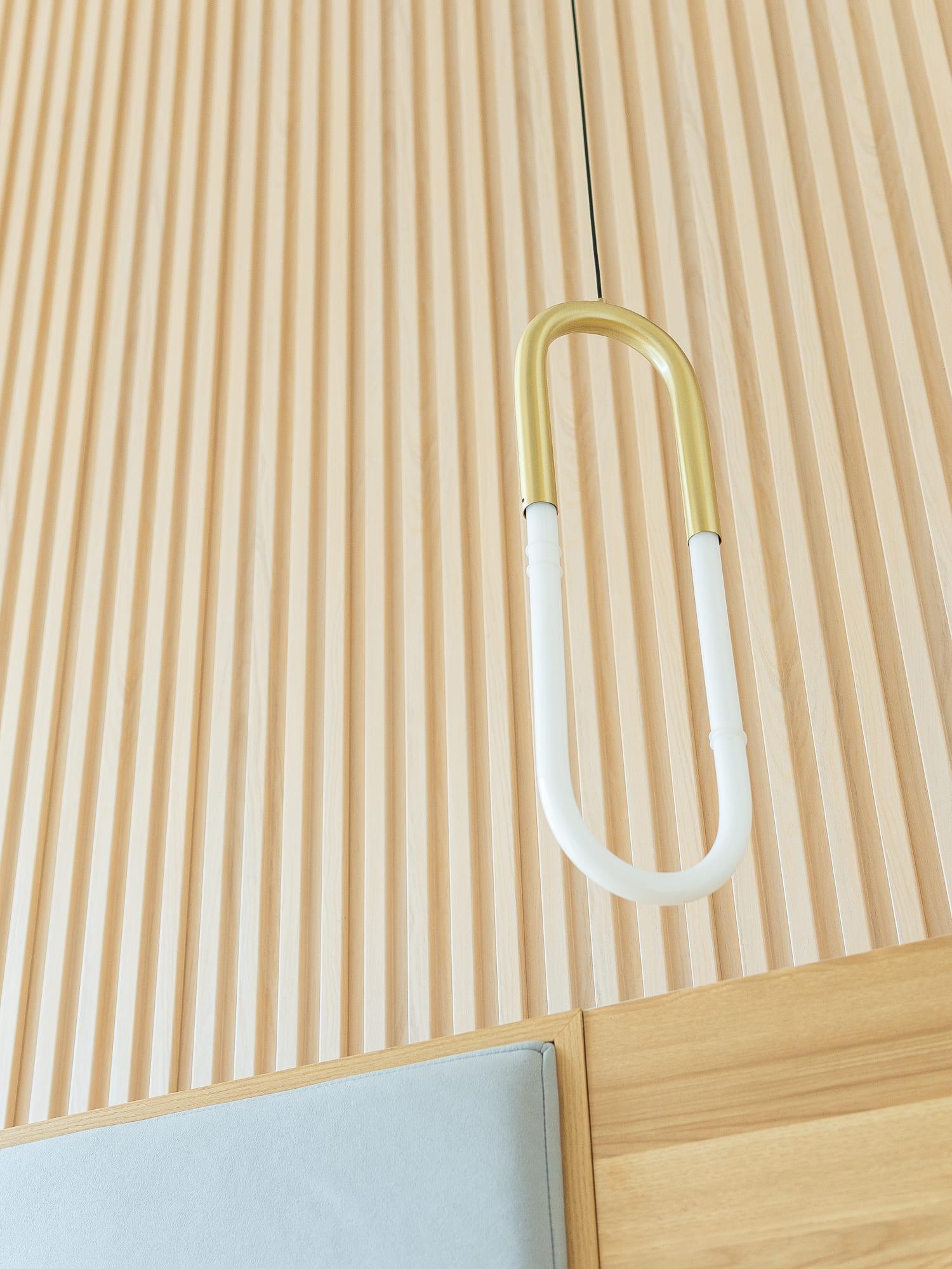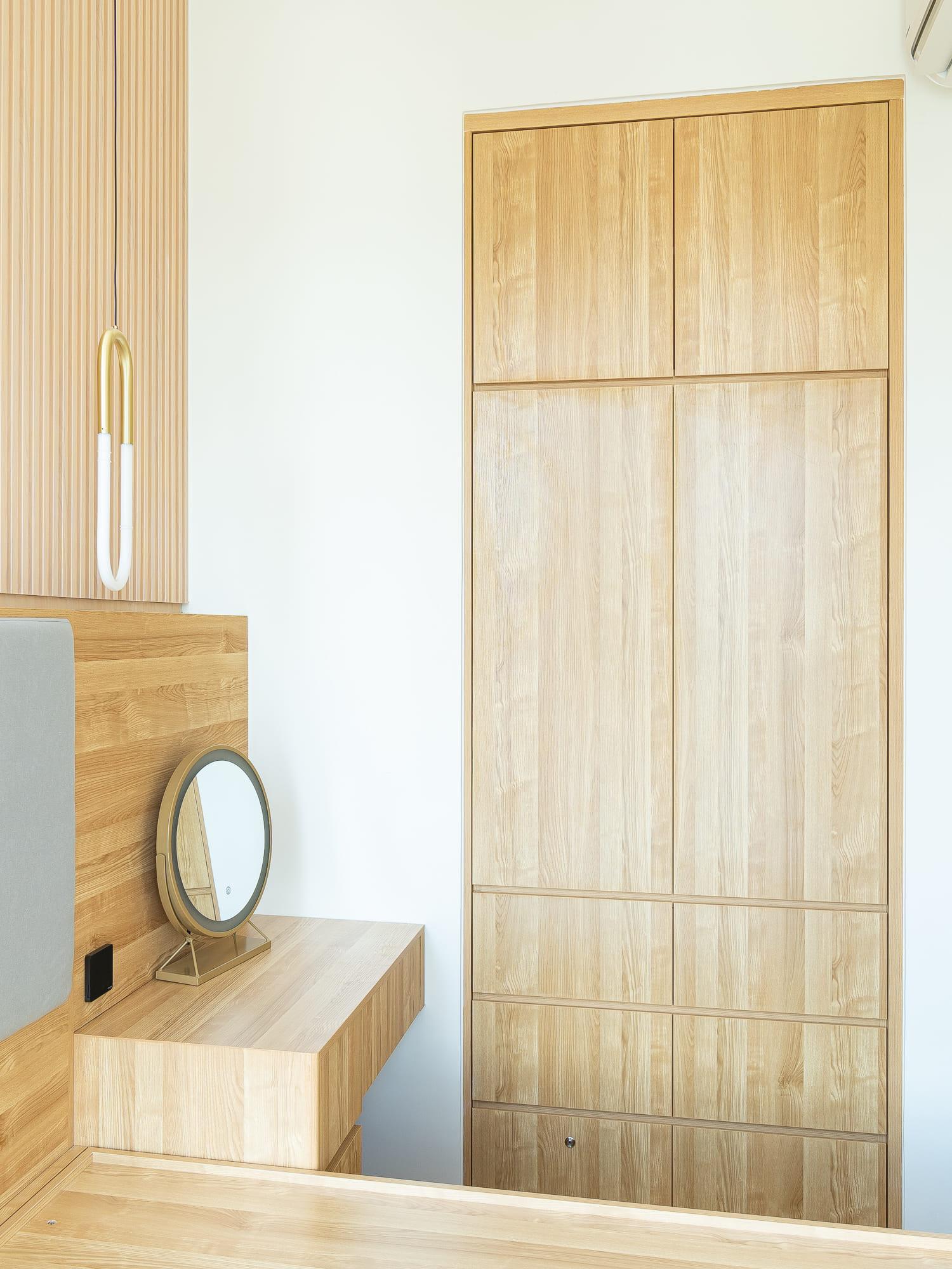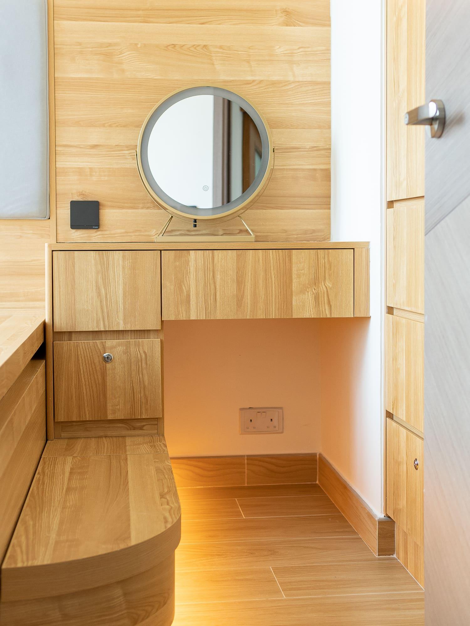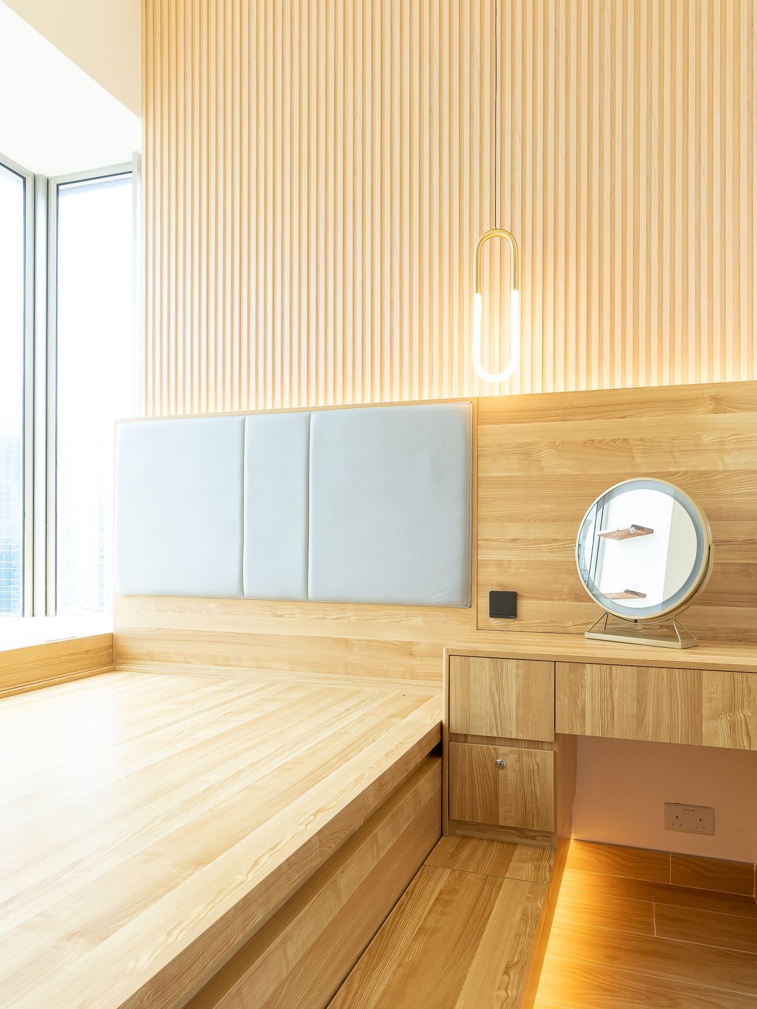 主人睡房訂造睡床及衣櫃,腳踏位造了彎角,兼有儲物的功能,床頭造了軟包,床頭的牆身選用了木條子做修飾,帶點日式設計的味道,而吊燈幫助點綴空間的氣氛,兼有照明的功用。香港地方空間淺窄,戶主亦不浪費窗台的空間,透過訂造傢俬在窗台造了儲物櫃,幫助收納雜物。