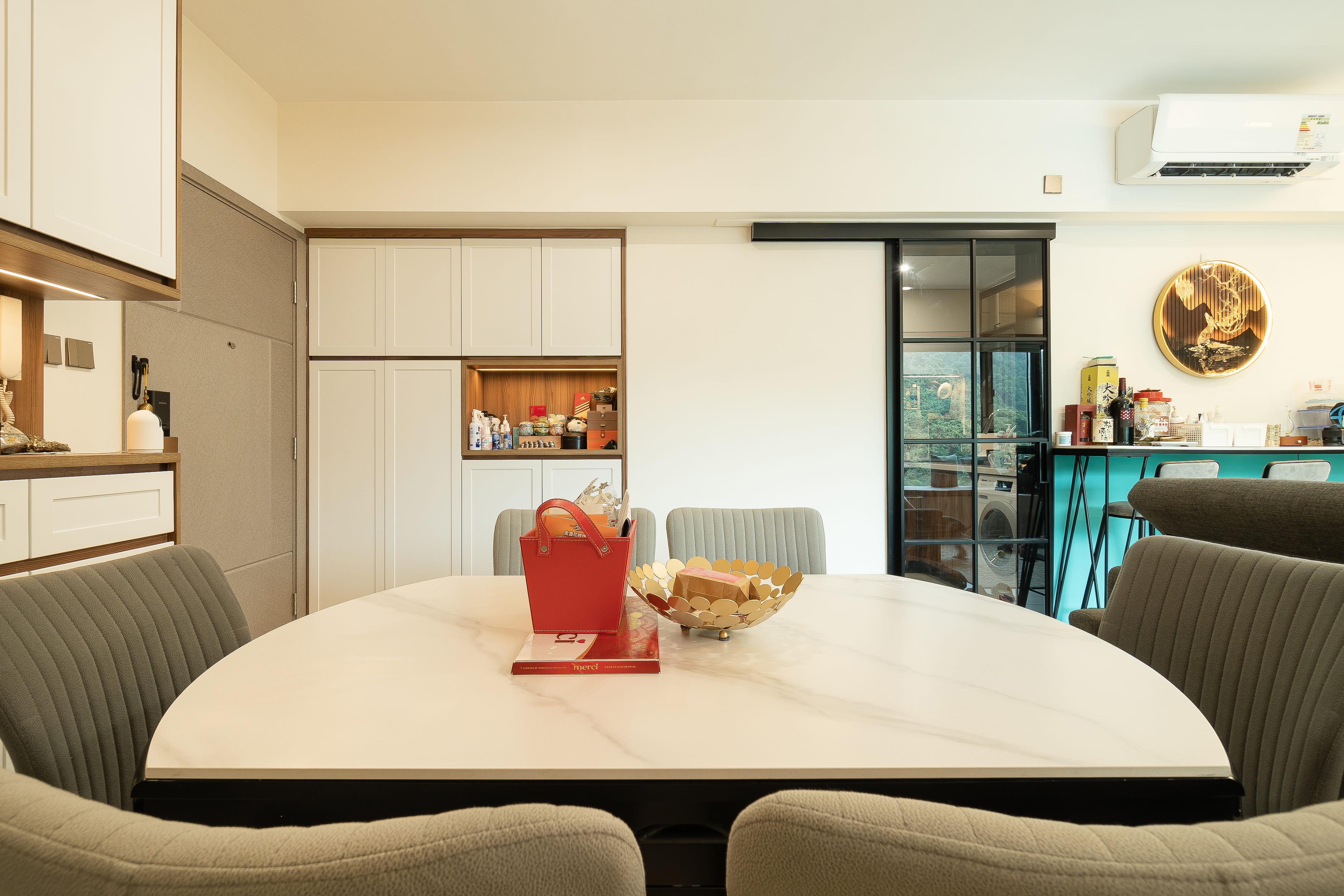 雖然戶主只是一人居住,但平時喜歡相約朋友共聚到家中品酒聊天,所以飯廳位置擺了一張多人餐桌,而戶主又特別喜歡雲石紋,所以特別選了一張雲石紋餐檯,而客廳一邊亦有一張吧檯作為品酒區,都是比較獨特的設計。