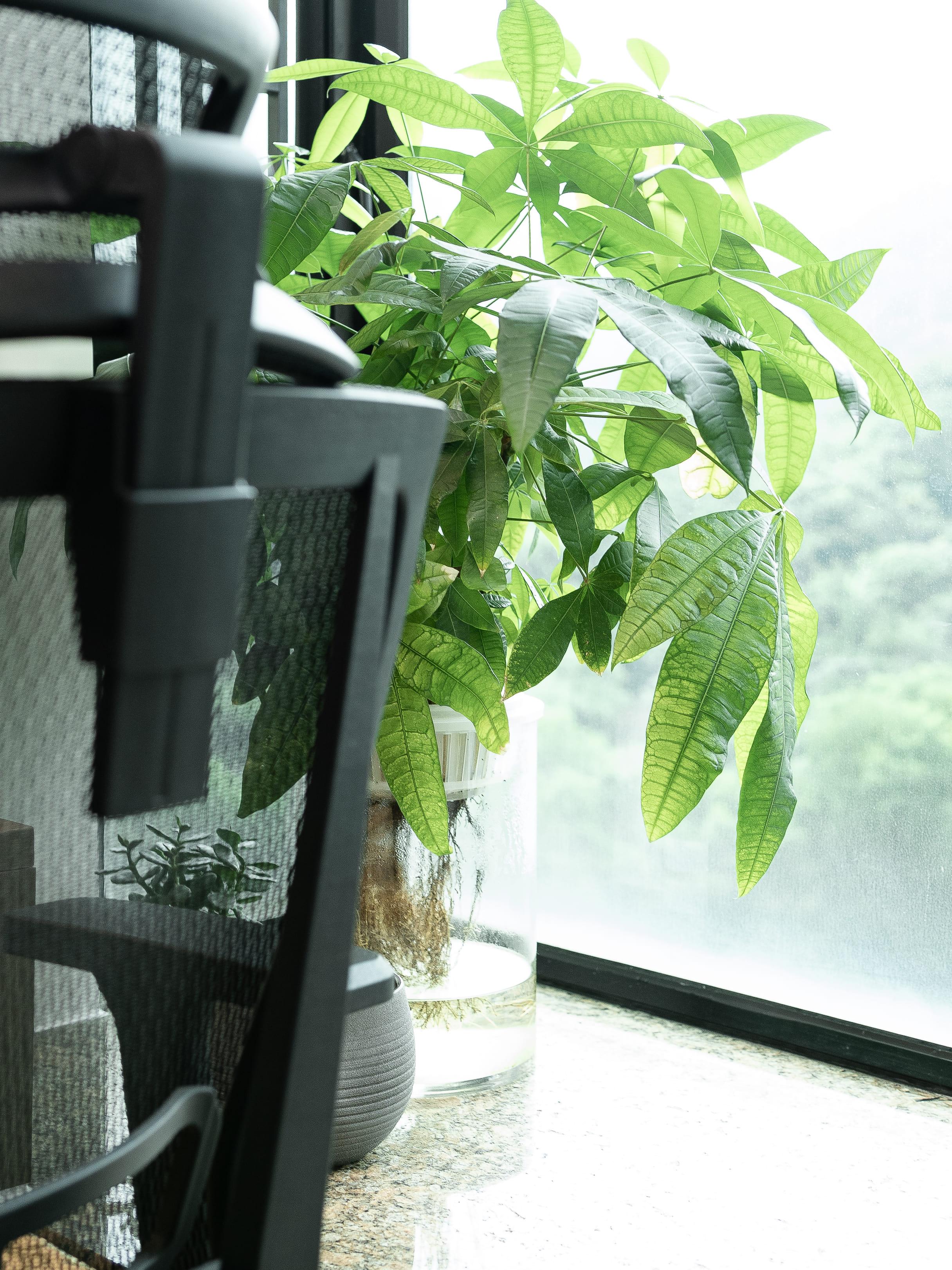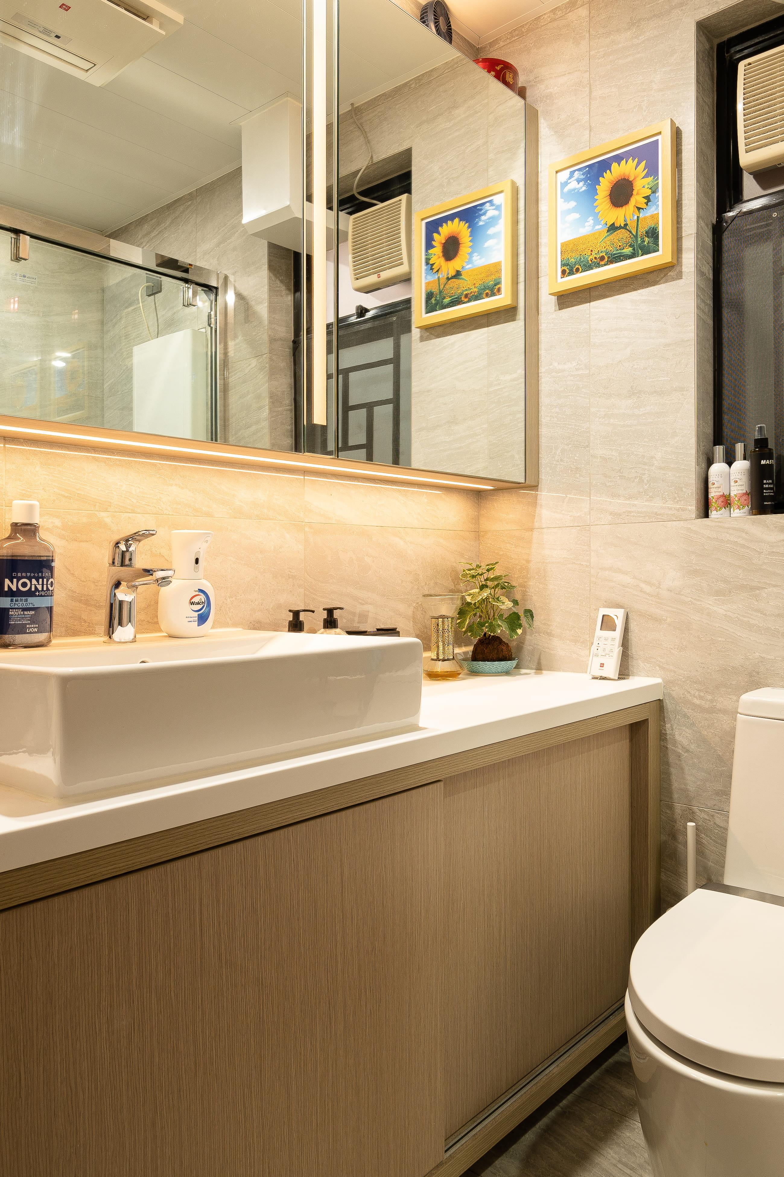 戶主喜歡簡約的設計元素,電視櫃下方造了一個矮櫃,牆身兩側就用了木條子的元素,帶點日式味道之外又不會過份單調,窗台位置除了放了綠色盆栽還有坐墊,除了有裝飾的用途外,亦令自己可以閒時可以望窗外的山景,放鬆心情,偶爾亦變成了愛狗的睡床。
