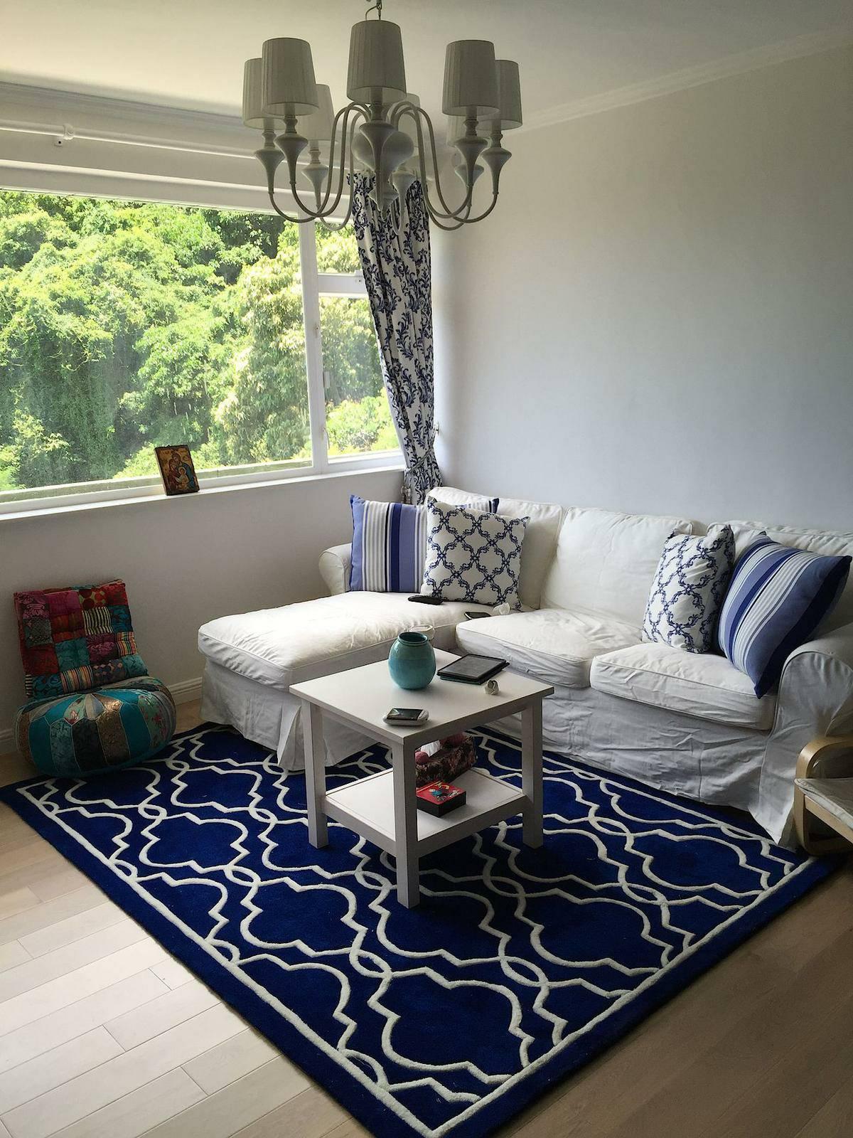 客廳放有米白色布藝大梳化,地下鋪有深藍色圖案地氈,配上典雅的吊燈,以及窗外嫩綠的山巒景致,很有置身外地的況味。