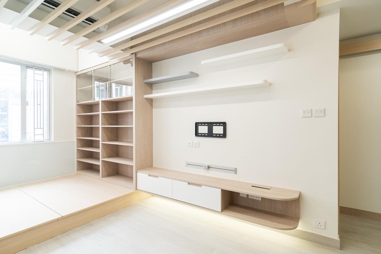 戶主選擇以木條子屏風來分隔客廳,營造出若隱若現的效果,有一種低調的美感,而在客廳之上,戶主亦裝上了木製假天花,除了避免直望到冷氣機的突兀,亦令到本來平平無奇的天花,變成了整個客廳的焦點,令客廳尤如一個小木盒,而客廳的盡頭處造了一個小地台,儼如一個塌塌米的小和室,一格格的層板櫃有很實際的功能,增加收納空間。