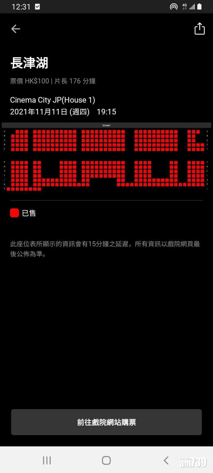 有網民留意到《長津湖》的門票,在多間戲院都賣到滿堂紅,其中以周六下午3時左右的場次,反應最熱烈,位於九展和銅鑼灣的Cinema City,以及奧海城的嘉禾,在差不多時段更連開2至5個影院。另有網民發現,周六下午2時50分於星影匯播出的場次,網上顯示票價為$58,888,估計是包場價錢。