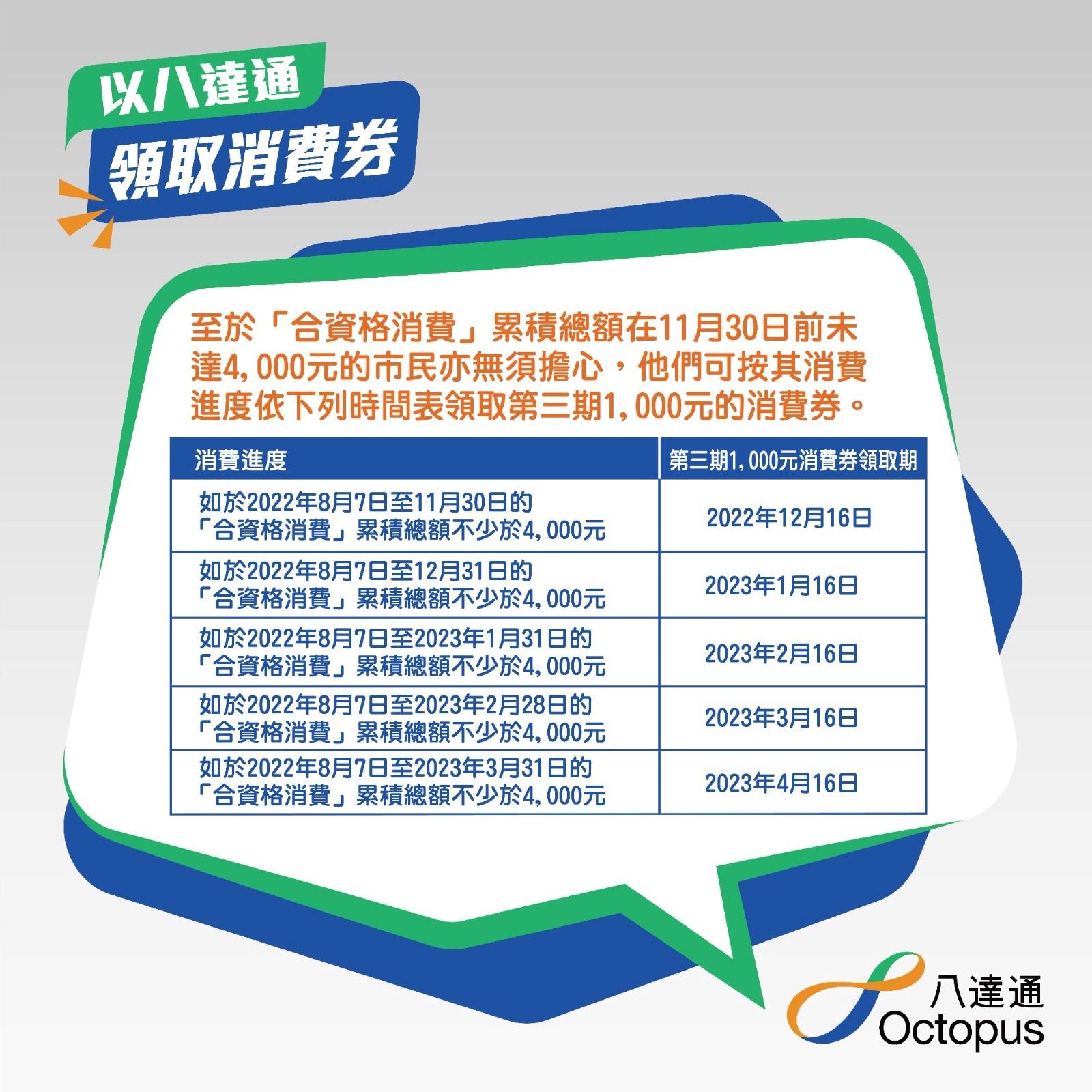 至於選用八達通的市民,使用期限較長,只要於2月28日前「合資格消費」滿4,000元,便可在3月16日起領取尾期1,000元消費券,或最遲於3月31日前「合資格消費」滿4,000元,使可於最後一個領取日、4月16日領取尾期1,000元消費券,否則將不合資格領取尾期款項,該1,000元同樣會被一筆勾銷。