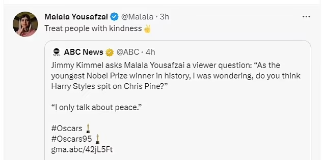 奧斯卡頒獎禮去年驚爆男星韋史密夫(Will Smith)上台怒摑口不擇言的黑人諧星基斯洛克(Chris Rock),今年輪到名嘴司儀基梅爾(Jimmy Kimmel)「玩大咗」,向出席典禮的諾貝爾和平獎最年輕得主馬拉拉(Malala Yousafzai)問了一條奇怪問題,而被斥為「國恥」,馬拉拉的得體回答則獲激讚。