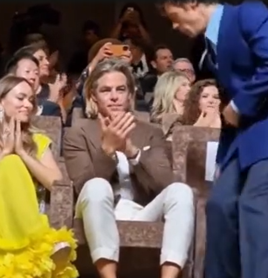 英國男歌手Harry Styles(右)出席威尼斯影展時,疑似向同片另一男演員Chris Pine(中)吐口水,事件被稱為「口水門」。(互聯網)