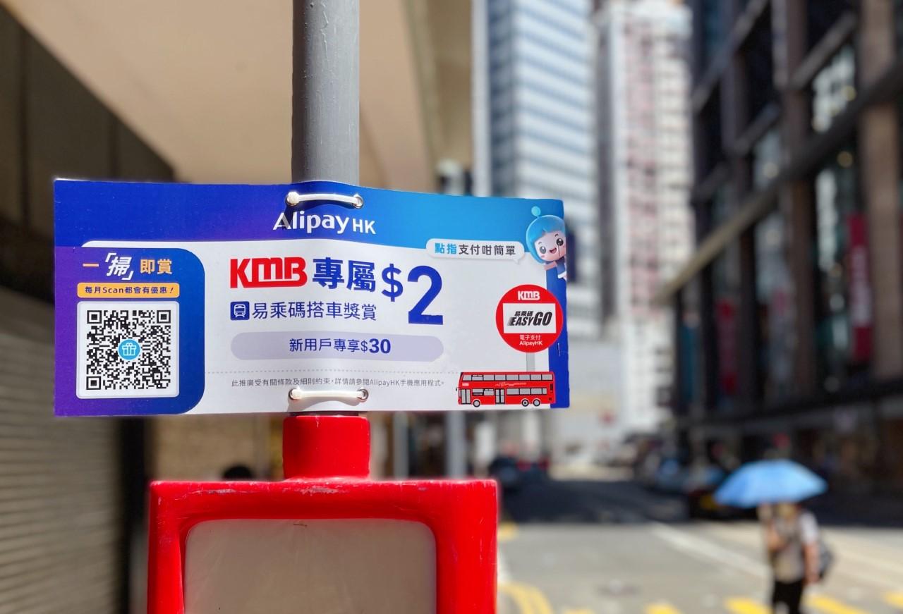 九巴表示,與AlipayHK推出「勁賞掃」九巴車資減免活動,由即日起乘客掃瞄全港800支九巴巴士站柱宣傳品二維碼,即可領取兩張1元九巴電子禮券,於下次乘搭九巴時,使用AlipayHK易乘碼支付車資,每程將自動扣減1元車資。