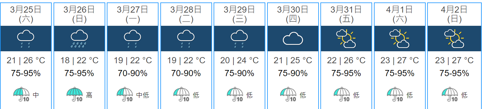 隨著位於廣東的一道冷鋒橫過沿岸地區,今明兩日該區驟雨增多及有狂風雷暴。受隨後的東北季候風影響,下週初沿岸地區天氣稍涼,仍然有雨。預料該季候風在下週中後期緩和,華南沿岸氣溫回升。