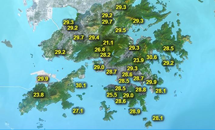 市區最高氣溫約32度,新界再高一兩度。晚上有幾陣雷暴。吹和緩南至西南風。展望明日初時驟雨較多及有幾陣雷暴。(香港天文台)