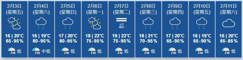 天文台又指,一股清勁至強風程度的偏東氣流會在未來一兩日影響廣東沿岸。同時,高空擾動會為該區帶來有雨的天氣。隨著高空擾動遠離及偏東氣流緩和,下周初華南沿岸天色較為明朗,氣溫回升,早晚有薄霧。預料一股東北季候風會在下周中後期影響華南。