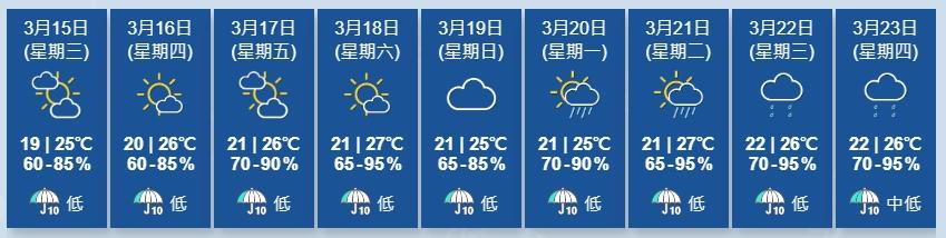 天文台又指,隨著東北季候風在本周中後期逐漸緩和,華南沿岸氣溫逐漸回升,日間溫暖。預料一股清勁偏東氣流會在星期日影響廣東沿岸,並在隨後一兩日逐漸被一股潮濕的偏南氣流取代。而一道低壓槽會在下周中期為華南帶來驟雨。