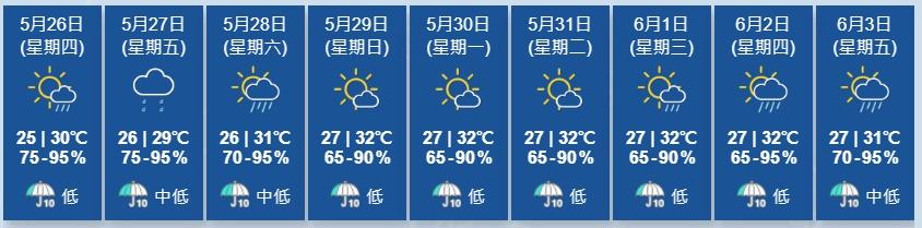 天文台指,廣闊低壓槽會在未來一兩日為南海北部及華南帶來驟雨。隨著位於西北太平洋的高空反氣旋向西伸展,下周初華南沿岸天色逐漸好轉。受西南氣流影響,下周中至後期該區天氣持續炎熱及有幾陣驟雨。
