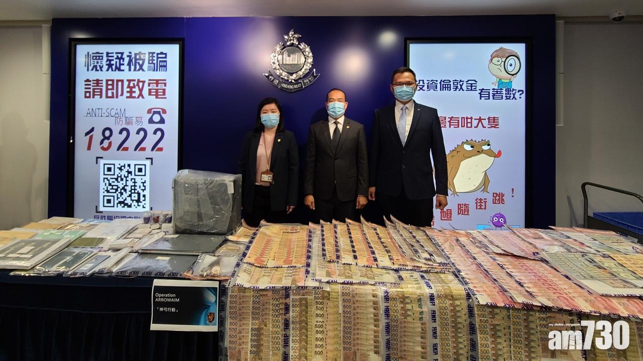 警方在該投資公司位於長沙灣及中環的辦事處,以及被捕人住所,搜出一批電腦、手機、銀行紀錄,以及公司文件,並檢獲現金83萬元,整個警方行動中,合共凍結騙徒資產7,700萬元。