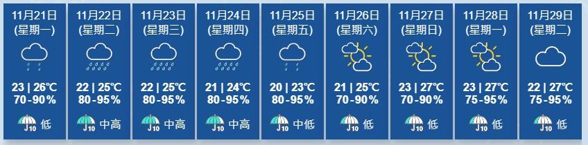 天文台又指,一股清勁至強風程度的東北季候風會在今明兩日影響廣東沿岸。此外,高空擾動會在本周中期為華南帶來驟雨。隨著高空擾動遠離,本周後期該區驟雨逐漸減少。
