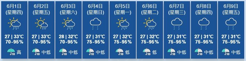 天文台指,受廣東內陸南移的強雷雨區影響,今早本港多處地區錄得超過30毫米雨量,而屯門及西貢更錄得超過50毫米。同時,香港境內錄得超過10,000次雲對地閃電。本港地區今日天氣預測大致多雲,有驟雨及強烈狂風雷暴,早上雨勢有時頗大。下午短暫時間有陽光及酷熱,市區最高氣溫約33度,新界再高一兩度。吹輕微至和緩西至西南風。展望未來兩三日有幾陣驟雨。明日天氣酷熱,局部地區有雷暴。