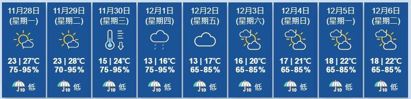 天文台又指,隨著高空反氣旋增強,華南沿岸今明兩日天色好轉,日間相當溫暖。預料一道冷鋒會在星期二晚至星期三早上橫過廣東沿岸,星期三該區北風增強,天氣顯著轉涼。受強烈東北季候風影響,本周後期該區早上相當清涼。天文台網頁顯示,氣溫會由周二最高28度急降至周三最低15度,相差13度。