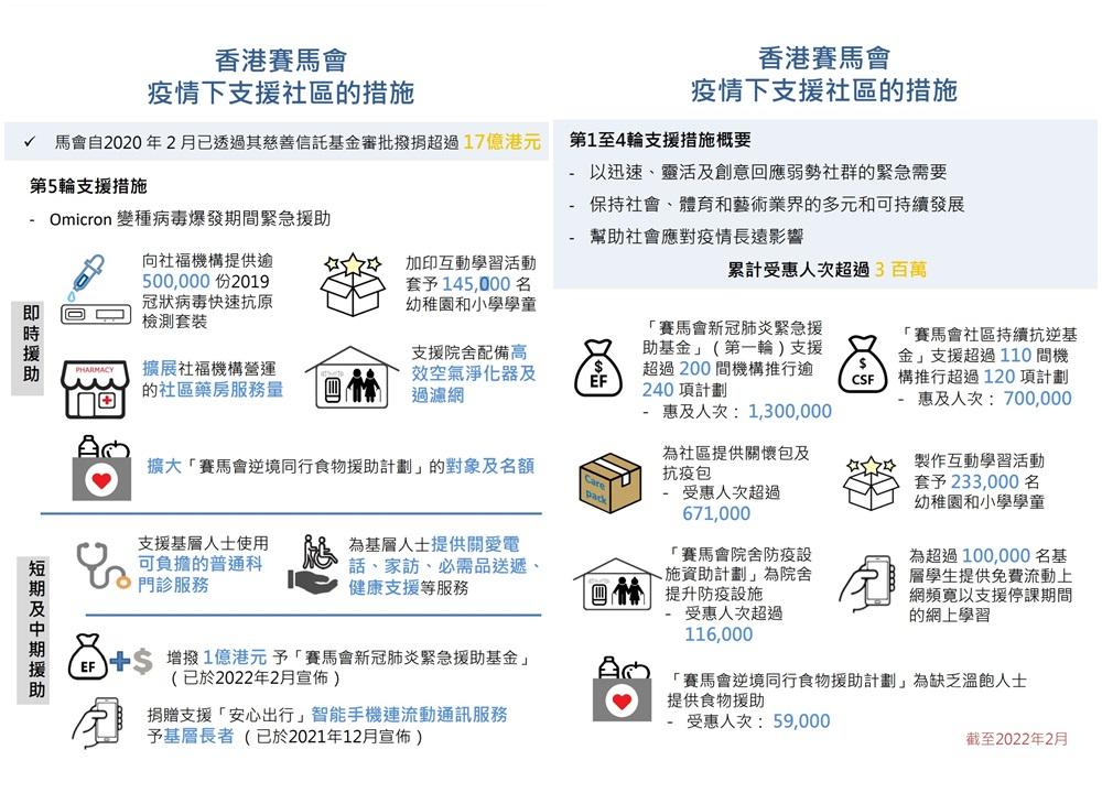 本港第五波疫情嚴峻,為回應社會迫切需要,賽馬會今日宣布新一輪抗疫措施,包括向合資格的社福機構提供50萬份快速抗原檢測套裝,以及擴展社區藥房服務等;另馬會指,過去兩年額外審批撥捐超過17億港元支持社會抗疫,包括今天及兩星期前先後撥捐2億9百萬港元應對第五波疫情,累計服務人次超過300 萬。