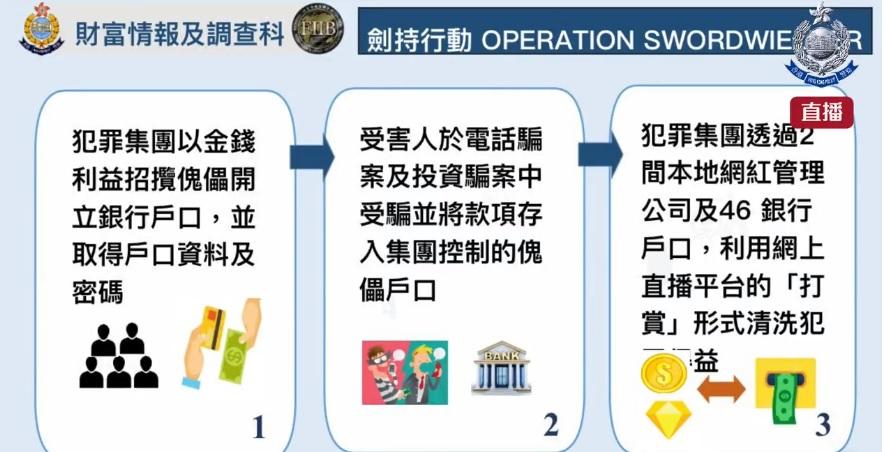 調查顯示,部分被捕人曾向相關集團提供自己的銀行戶口以換取約2,000元的報酬;而該集團其後則利用該批戶口收取騙款,並利用直播平台的代幣打賞制度「洗黑錢」。莙員調查後相信被捕人與2021年11月至2022年7月發生的66宗騙案有關,包括投資騙案、求職騙案、網上情緣騙案及網上購物騙案等。他們涉嫌利用至少46個本地銀行戶口清洗超過5.6億元的犯罪得益。警方已成功阻截459萬元的懷疑犯罪得益轉移,並檢獲26部手提電話、2部電腦、一批銀行文件及銀行卡等。