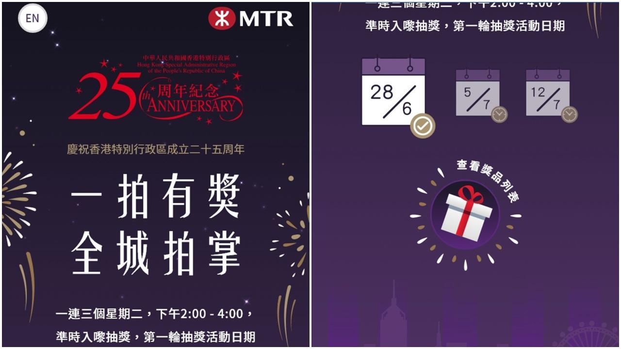 為慶祝香港回歸25周年,港鐵透過應用程式「MTR Mobile」推出「一拍有獎」抽獎活動。(MTR Mobile截圖)