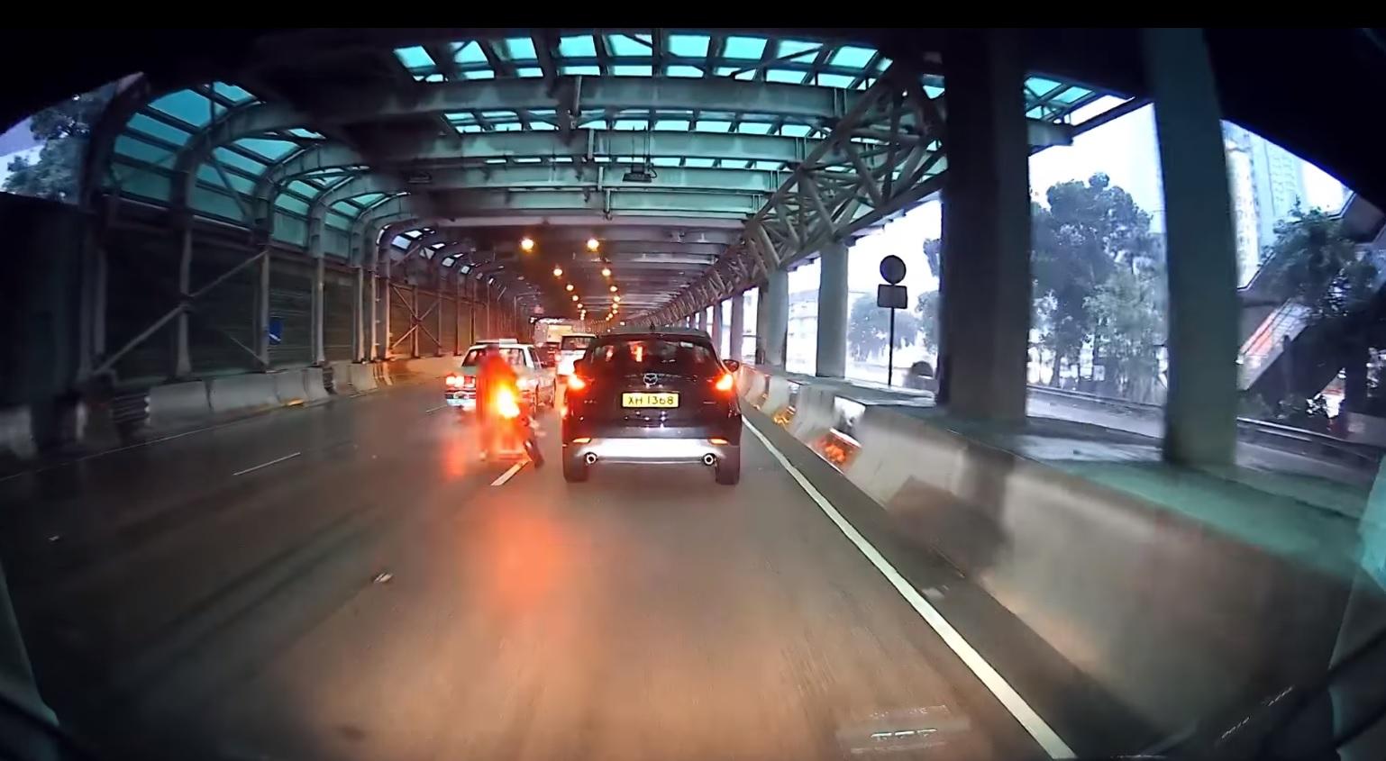天文台今日凌晨起發出黃色暴雨警告信號,維持約4小時,黃雨懸掛期間於早上7時許,該名鐵騎士於屯門公路往九龍方向、沿慢線行駛行駛,從網上的車Cam片段可見,當電單車駛至近兆康時,前方的私家車收慢,電單車打算從左方切線至中線時,懷疑私家車突然煞停,結果電單車撞私家車左邊車尾,左搖右擺後,連人帶車倒在中線及快線之間,險被後方私家車輾過。警方指事件中無人受傷。
