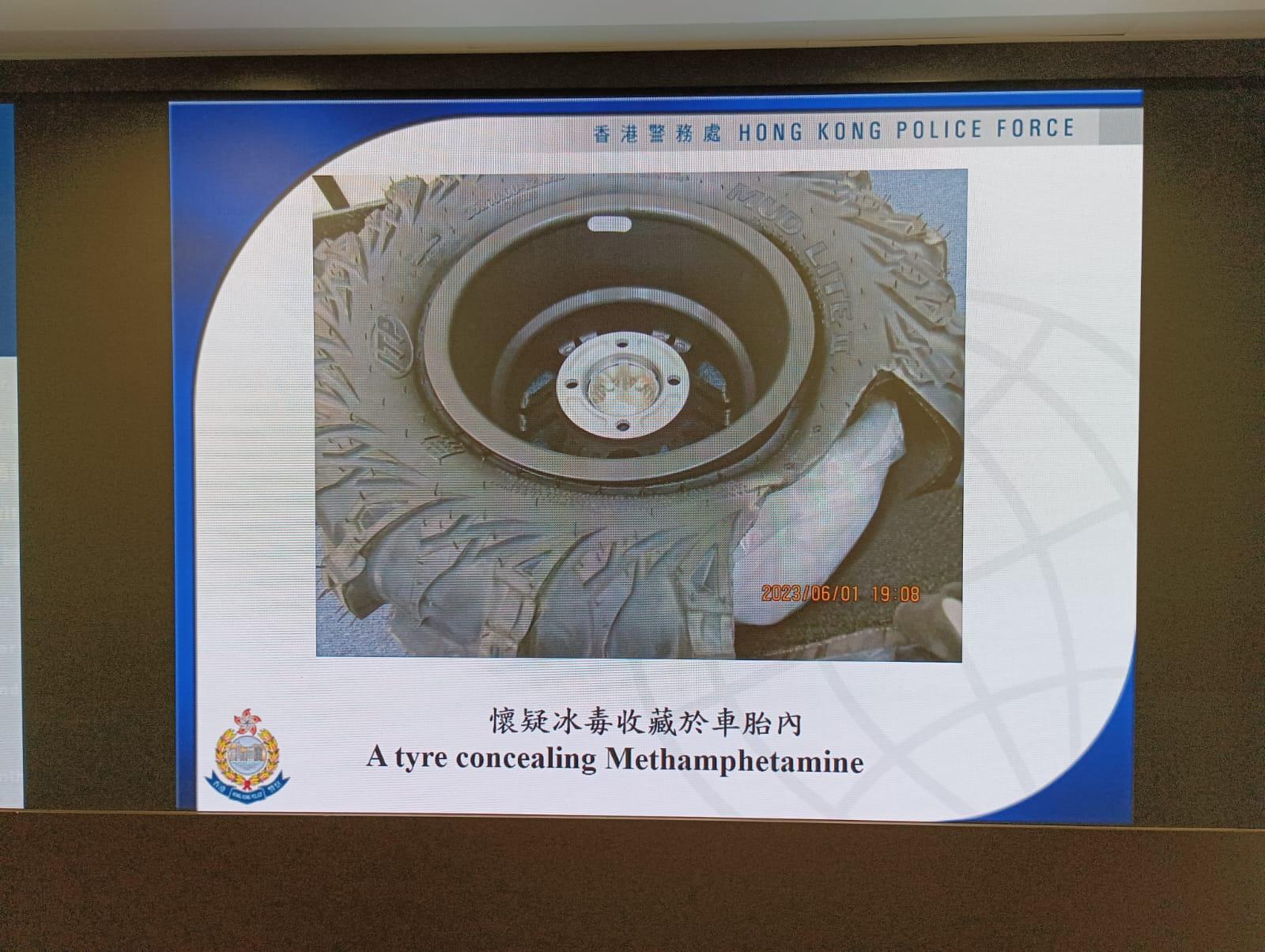 同日探員於元朗喜業街一工廈埋伏,發現一名形迹可疑女子,當她離開單位後,探員上前截查,在其手袋內檢獲一包重1公斤冰毒,再將她返單位內搜查,在單位內發現8條車胎,其中一條已遭割開,內藏6包每包重1公斤冰毒,探員割開其餘7條車胎,共檢獲52包重52公斤冰毒,拘捕該名22歲姓方的內地持雙程證無業女子,涉販運危險藥物罪。