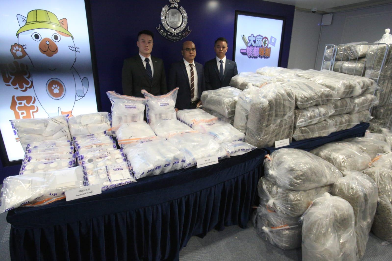 警方破獲3宗販毒案件,檢獲約300公斤懷疑大麻、約59公斤懷疑冰毒,及約14公斤懷疑海洛英,估計總市值約1.1億元,4人被捕,仍在扣查中,明日(3日)分別在觀塘及粉嶺裁判法院提訊。