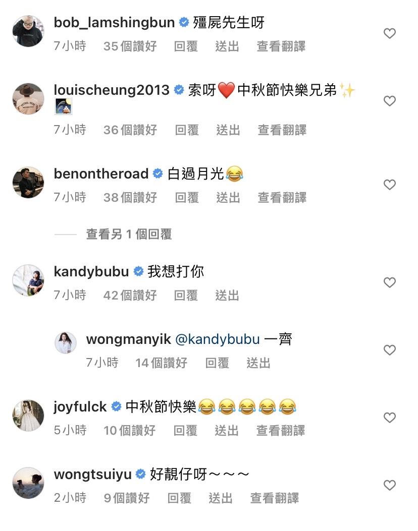 帖文一出,吸引不少圈中好友紛紛留言,林盛斌(Bob)指:「殭屍先生呀」、張繼聰則大讚:「索呀,中秋節快樂兄弟」、而袁偉豪留言謂:「白過月光」、糖妹及王敏奕均表示:「我想打你」,更有人笑言叫Bosco 留待萬聖節再Po過,相當搞笑。