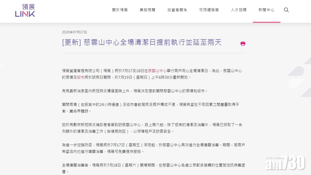 領展指,關閉商場及街市是由於區內新冠肺炎傳播風險上升,場地關閉期間,商戶可進場,但必須事先跟慈雲山中心辦事處登記。