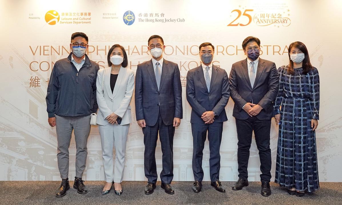 文化體育及旅遊局局長楊潤雄(左三)、馬會主席利子厚(右三)、立法會議員(體育、演藝、文化及出版界功能界別)霍啟剛伉儷(右一、二)、西九文化區管理局行政總裁馮程淑儀(左二)等嘉賓欣賞由馬會獨家贊助的維也納愛樂樂團香港音樂會。