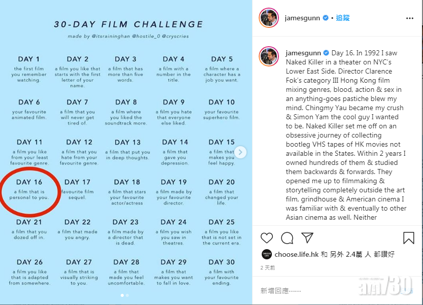 憑Marvel電影《銀河守護隊》系列聲名大躁的荷李活導演James Gunn,近日在IG進行「30天電影挑戰」(30 Days Challenge),連續30日分享有關電影的題目,兩部港產片《赤裸羔羊》(Naked Killer)和《功夫》亦榜上有名。前日他談到「對我意義重大的電影」(A Film that is personal to you)時,選了由霍耀良執導、王晶編劇和監製的三級Cult 片《赤裸羔羊》,他自言愛上性感女神邱淑貞,同時奉任達華為渴望成為的一樣的男人,從此成為港產片忠粉。